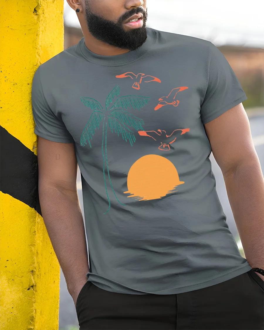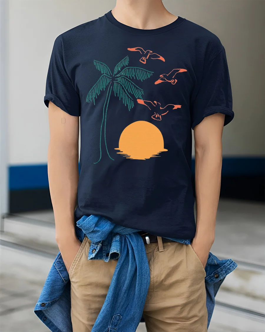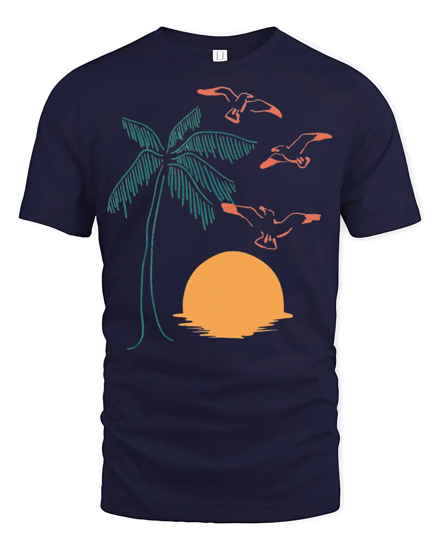 Retro Palm Tree Sunset Birds Coastal Beach Graphic Tee captures the peaceful atmosphere of ocean sunsets and tropical scenery through a clean artistic illustration.