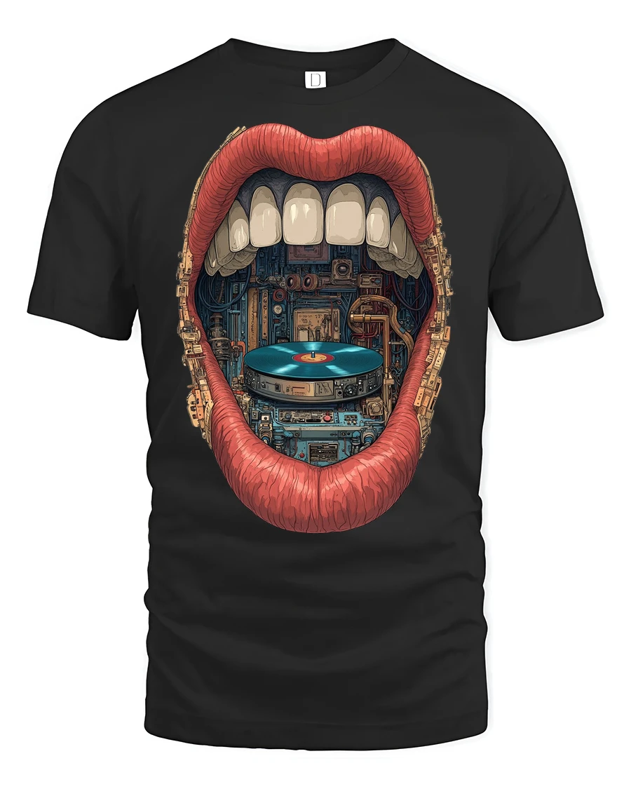 This retro vinyl record DJ lips graphic t shirt combines bold rock style with vintage music culture in a striking artistic design.
