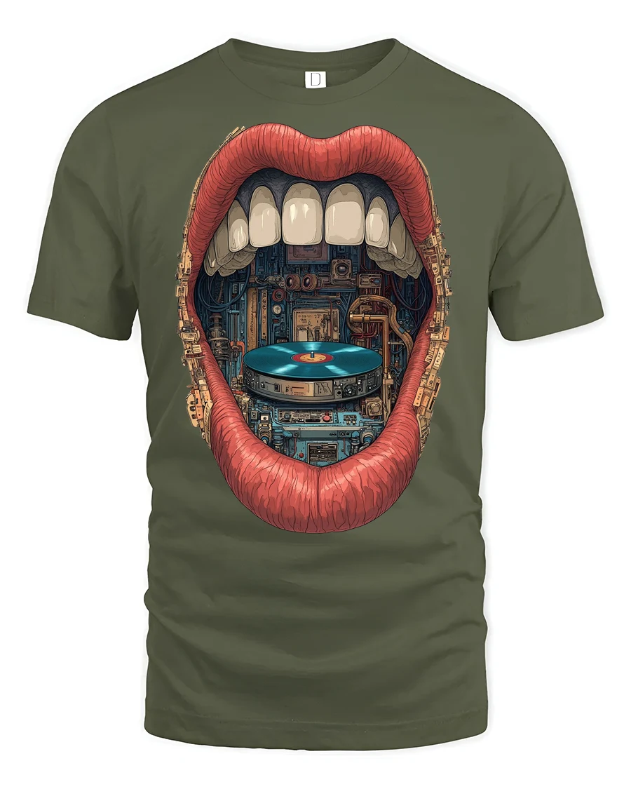 Retro Vinyl Record DJ Lips Graphic T Shirt Vintage Music Lover Tee - military green t-shirt on white background