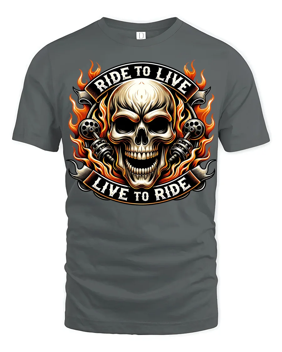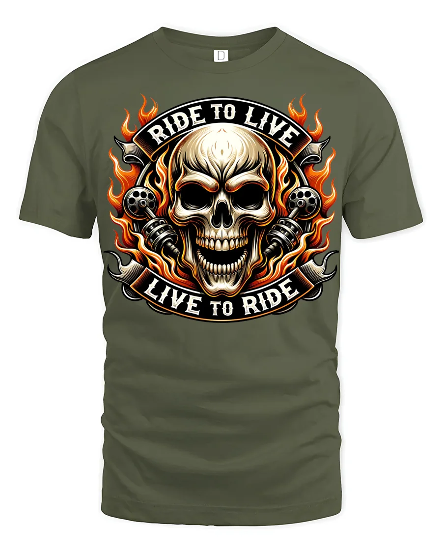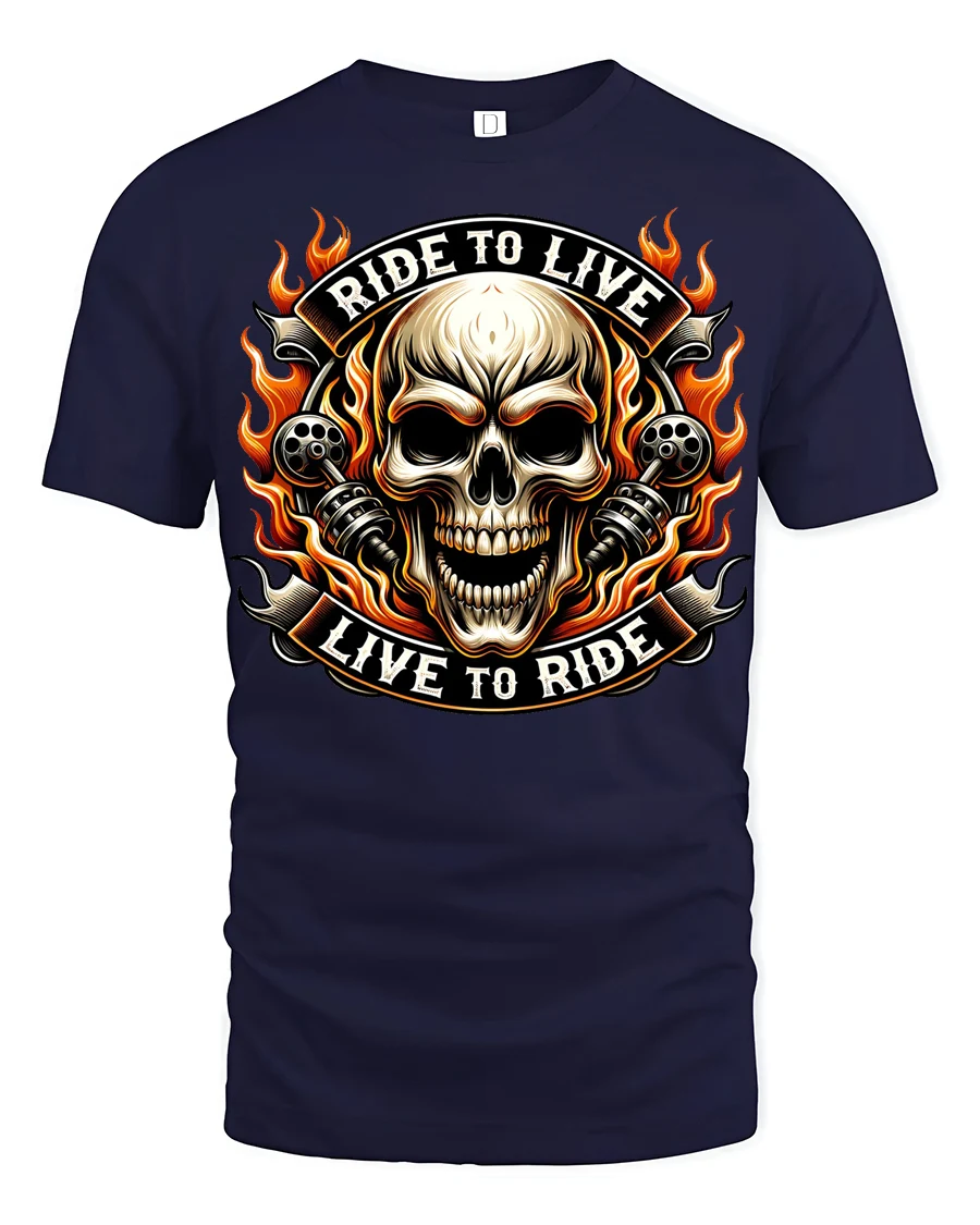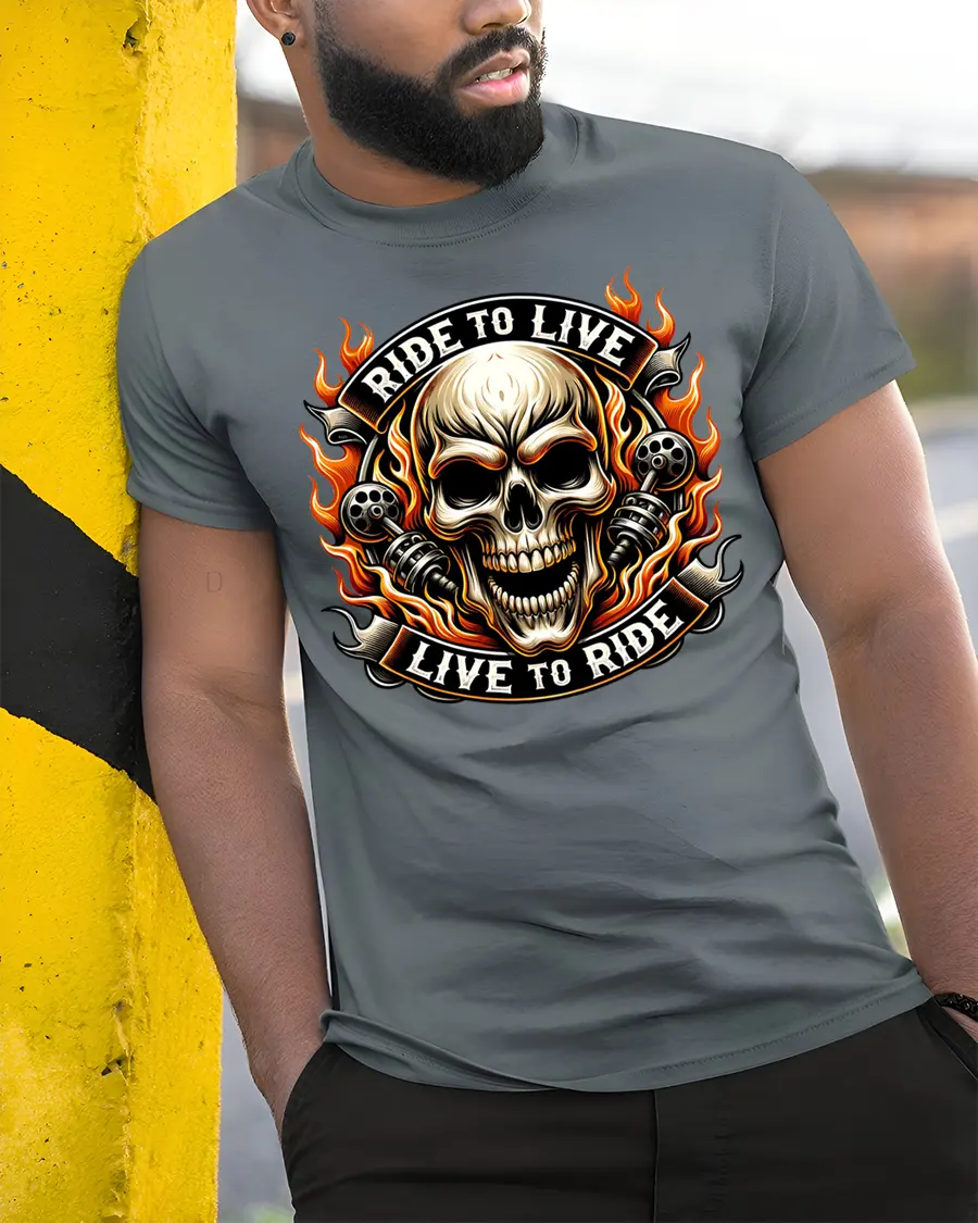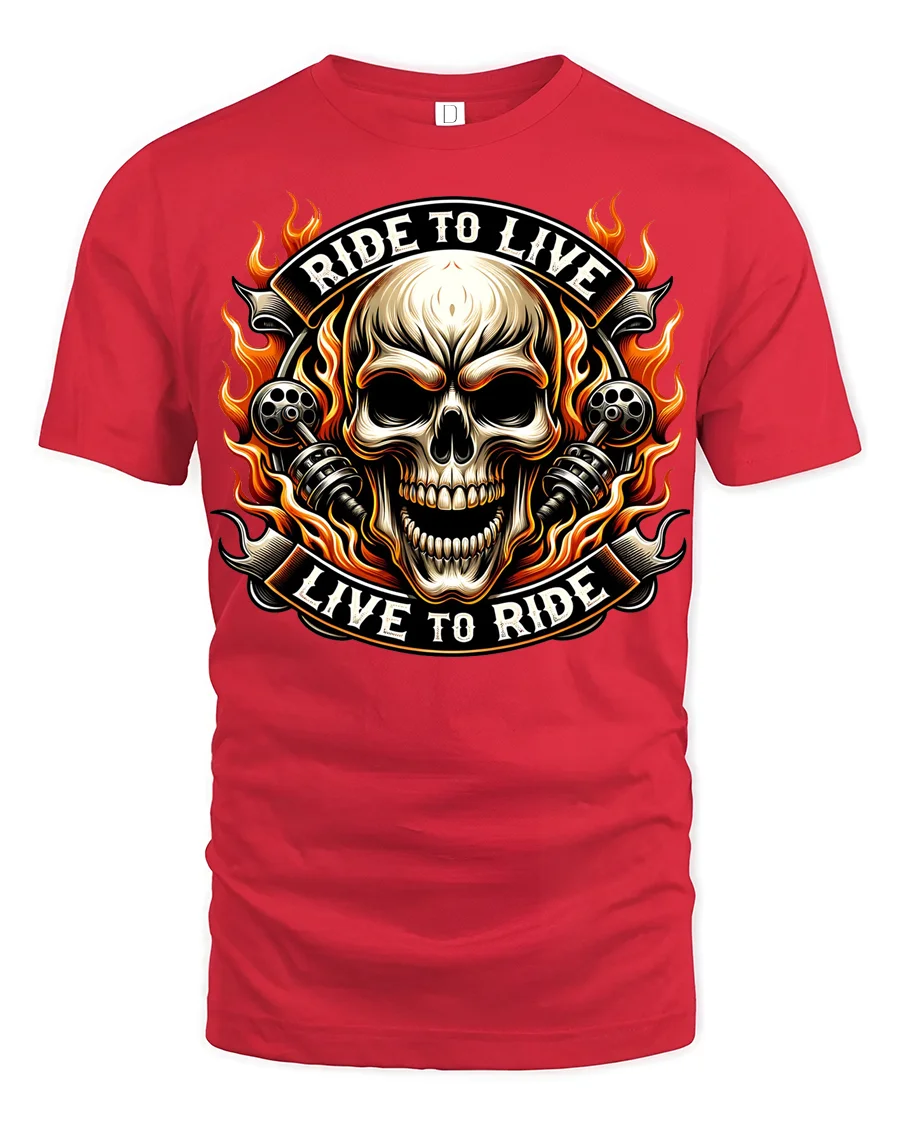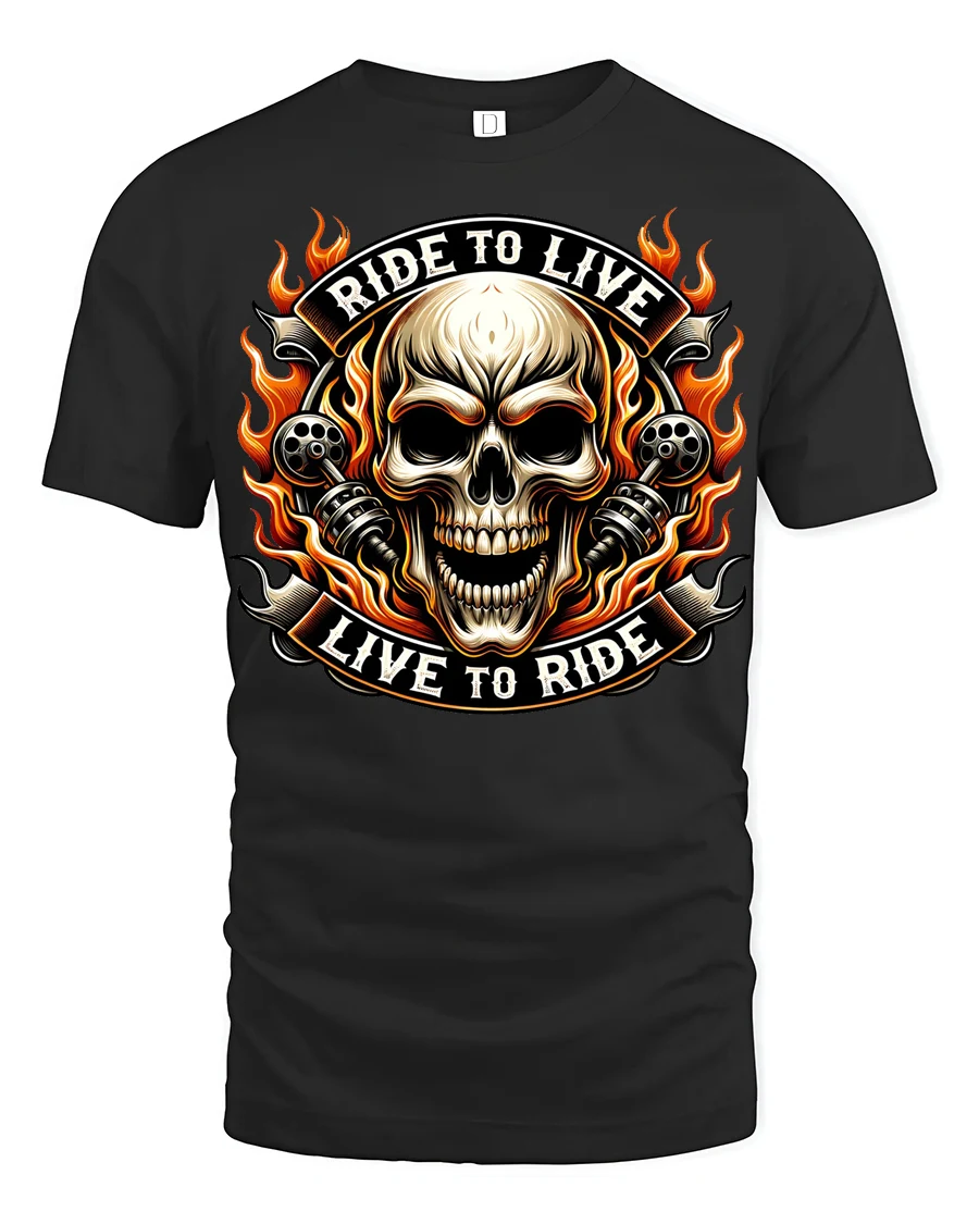 Ride To Live Live To Ride Flaming Skull Biker Graphic T Shirt captures the raw spirit of motorcycle culture with a bold flaming skull design that instantly stands out.