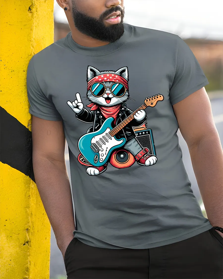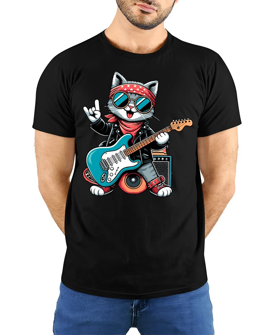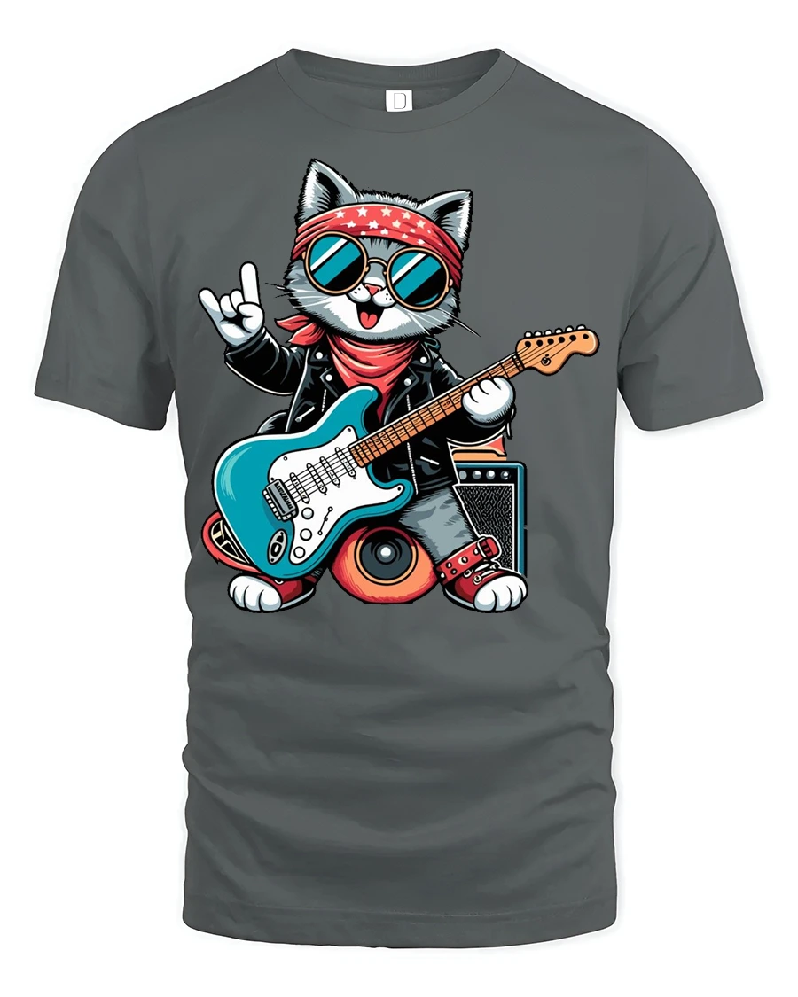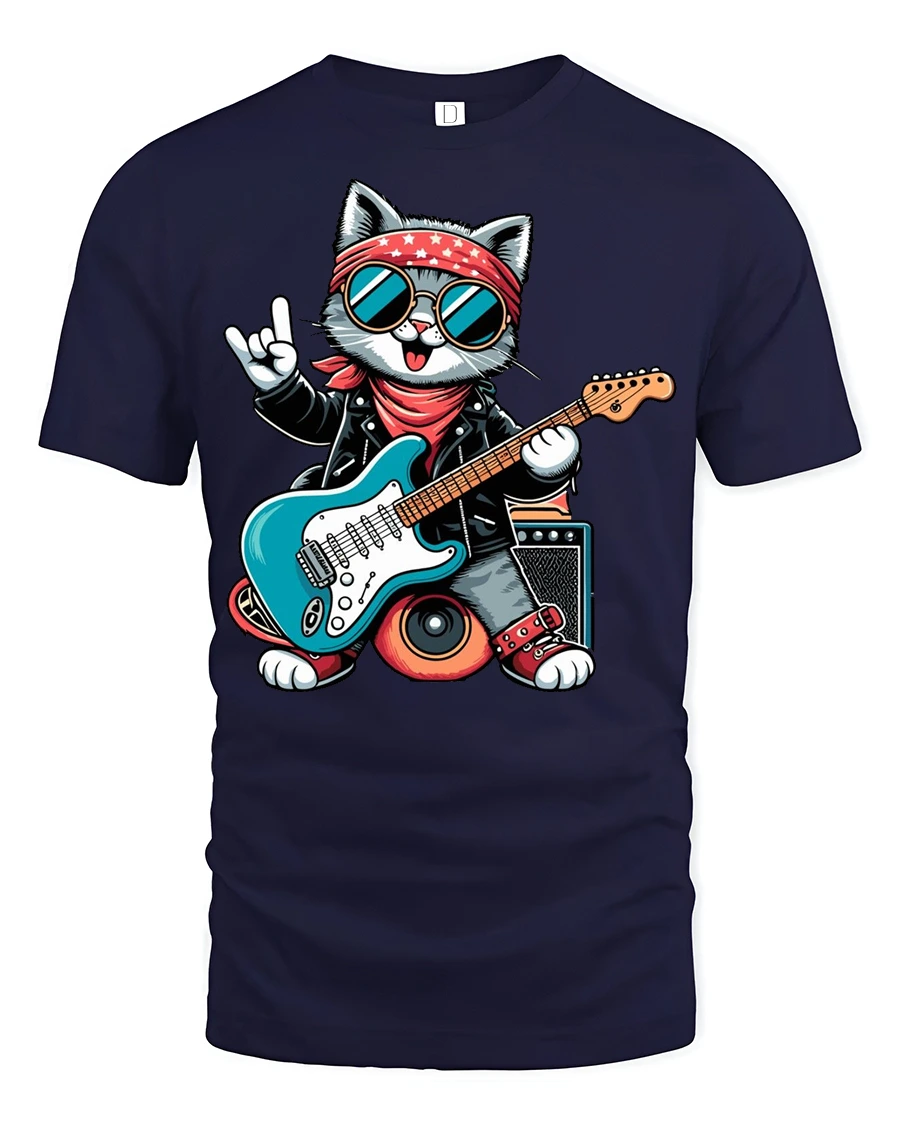 Rock Star Cat Playing Guitar Cool Cartoon Graphic T Shirt brings energetic music vibes and playful style together in one bold design.