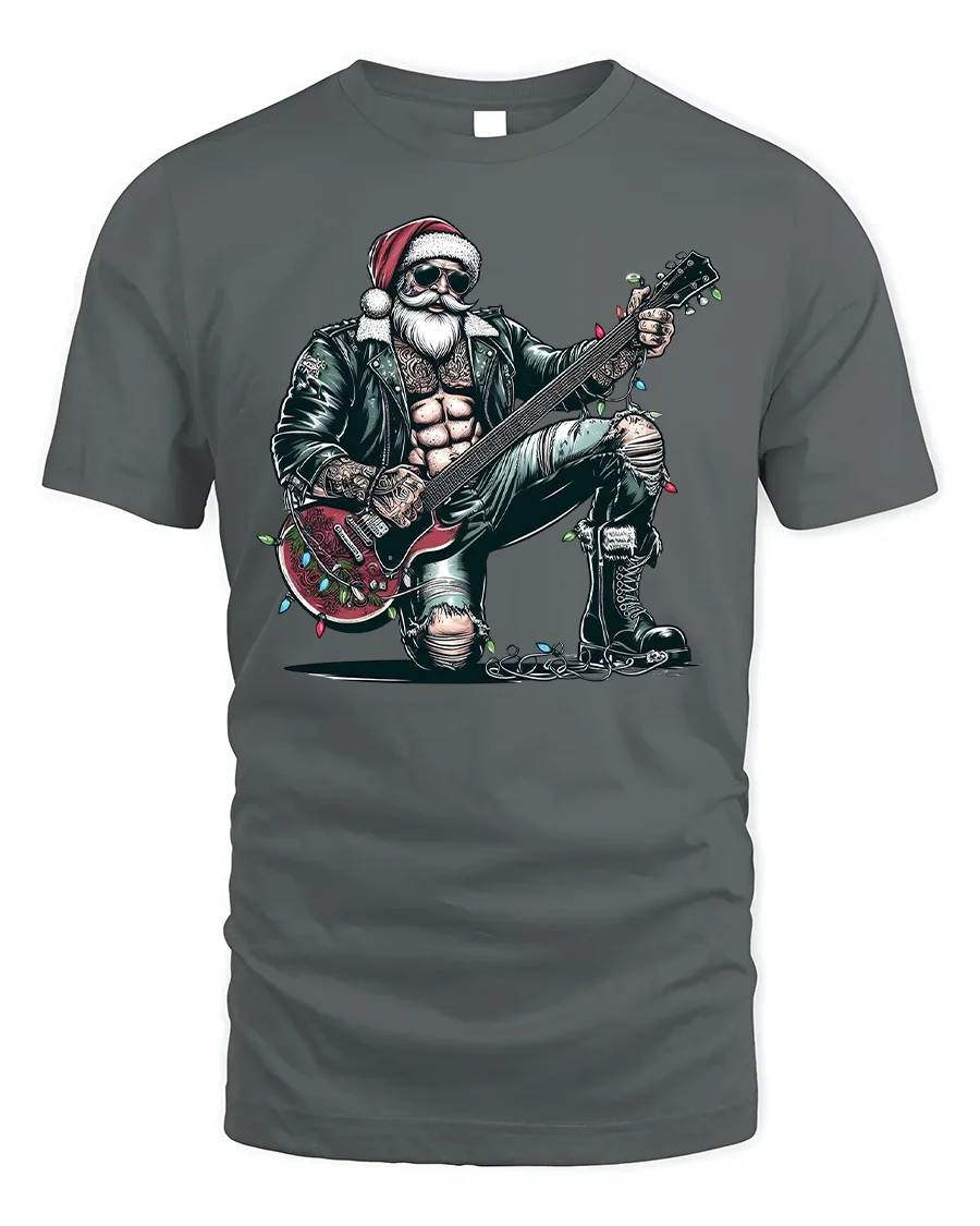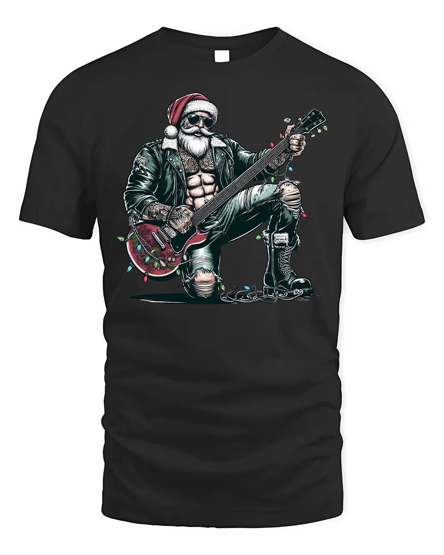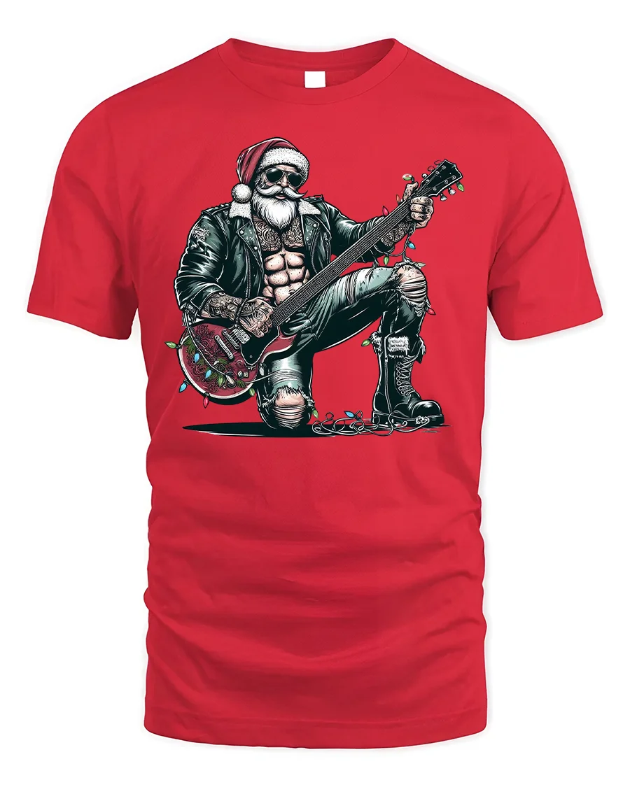 Turn up the volume this holiday season with the Rockstar Santa Guitar Christmas Holiday Graphic Tshirt, a bold design that combines festive cheer with rock-and-roll energy. Featuring a ripped Santa Claus dressed in a leather jacket, boots, and tattoos while rocking out on an electric guitar, this tee adds a rebellious twist to traditional Christmas fashion. Surrounded by festive lights, it’s perfect for anyone who loves music, style, and holiday fun.