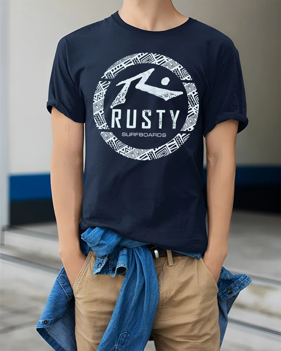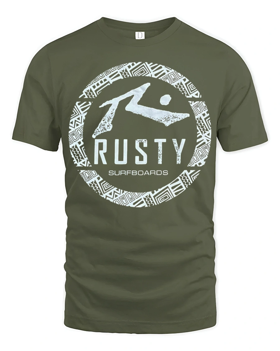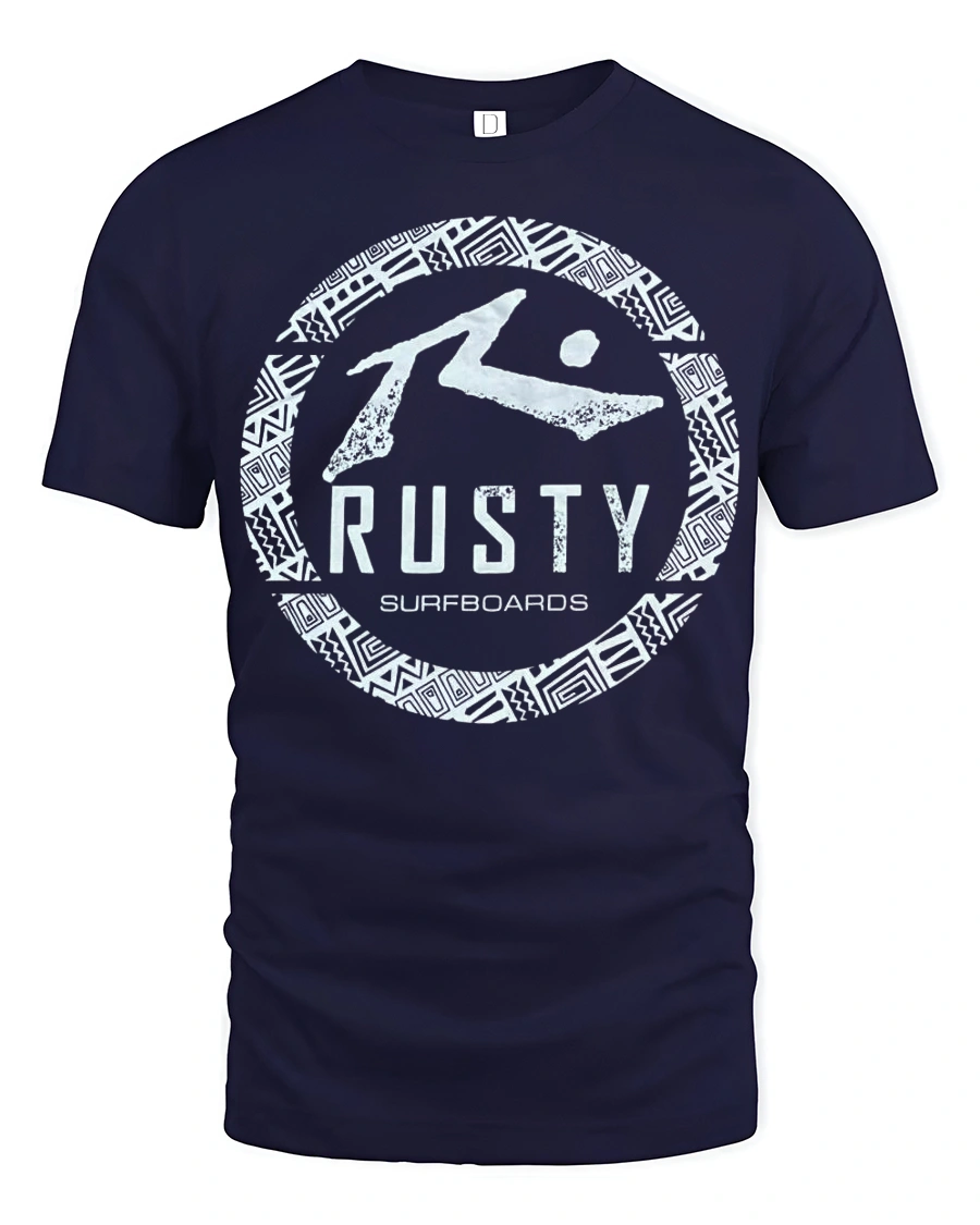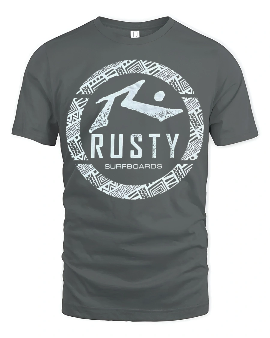 Rusty Surfboards Retro Surf Logo Beach Vibe Graphic Tee Tshirt captures the spirit of surf culture with a bold and timeless design.