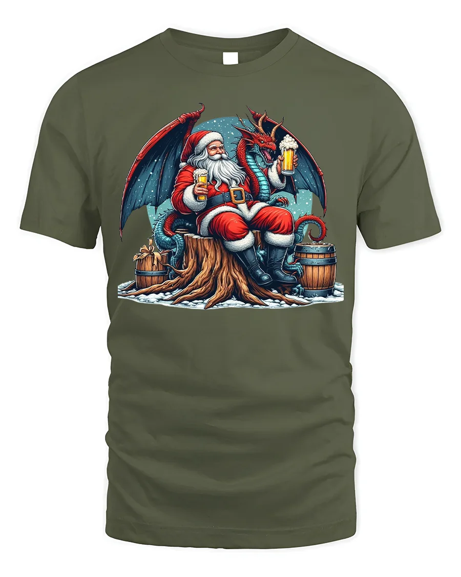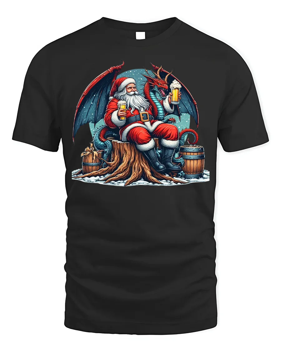 Bring mythical fun to your holidays with this Santa Drinking Beer with Dragon Christmas T-Shirt, a one-of-a-kind design that combines festive cheer with fantasy magic. Featuring Santa Claus relaxing on a snowy tree stump, raising a frosty beer while sitting beside a mighty dragon, this shirt puts a bold twist on classic Christmas apparel. The detailed artwork creates a mix of humor, strength, and holiday spirit, making it a perfect choice for those who love unique seasonal fashion.