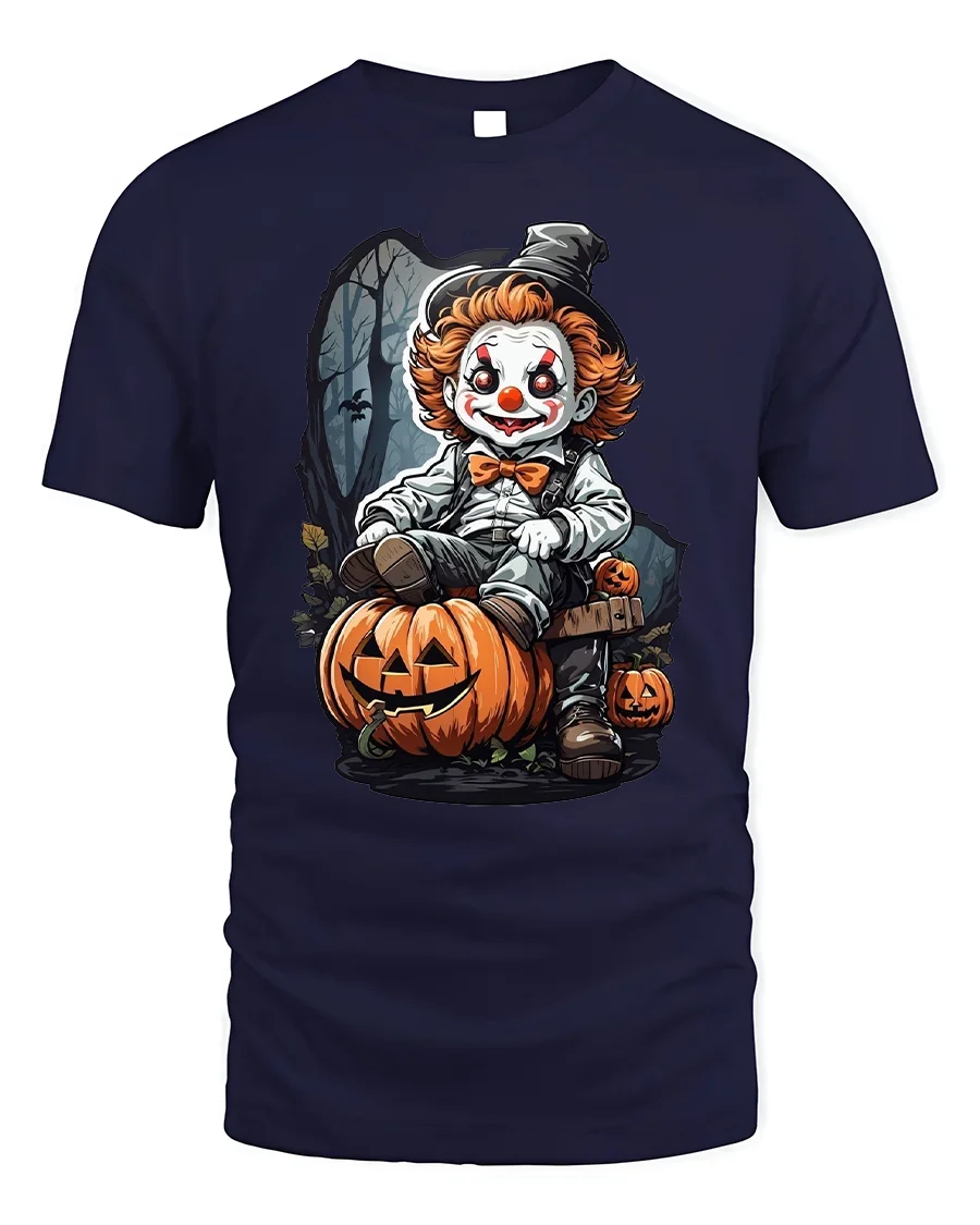 Scary Clown Halloween Pumpkin Graphic T-Shirt is the perfect choice for anyone who loves spooky vibes and creepy fun during the Halloween season. Featuring a bold and detailed design of a sinister clown sitting on a carved pumpkin, this shirt captures the dark and playful spirit of October nights. The vibrant artwork pops against the black background, making it a standout piece in your Halloween wardrobe.