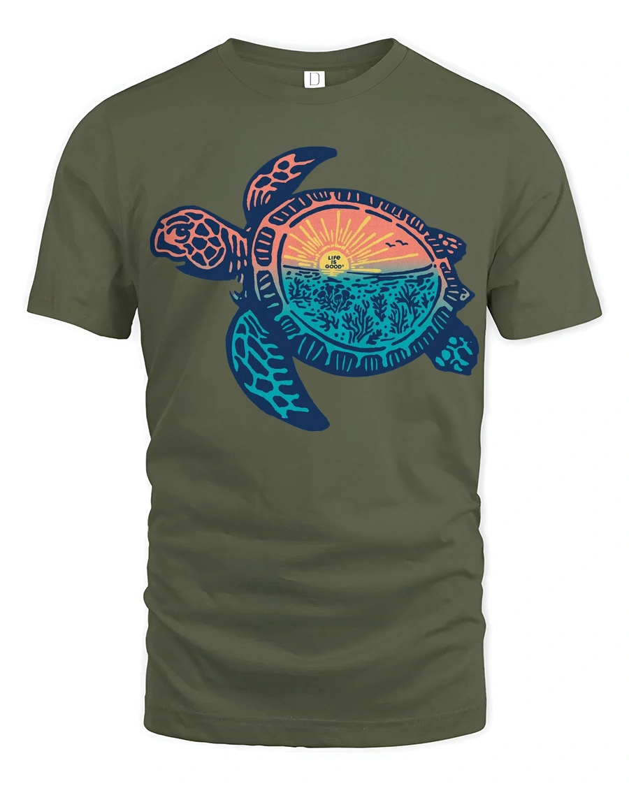 Sea Turtle Sunset Ocean Life Graphic Tee Coastal Aesthetic - military green t-shirt on white background