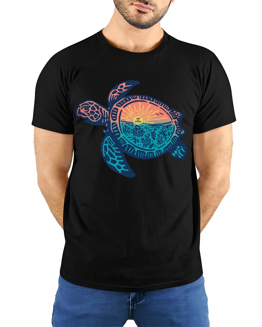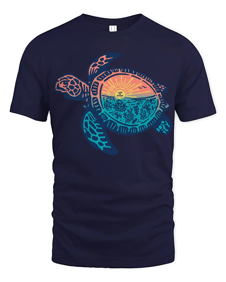 Sea Turtle Sunset Ocean Life Graphic Tee Coastal Aesthetic expresses the peaceful beauty of the ocean combined with a colorful sunset horizon.
