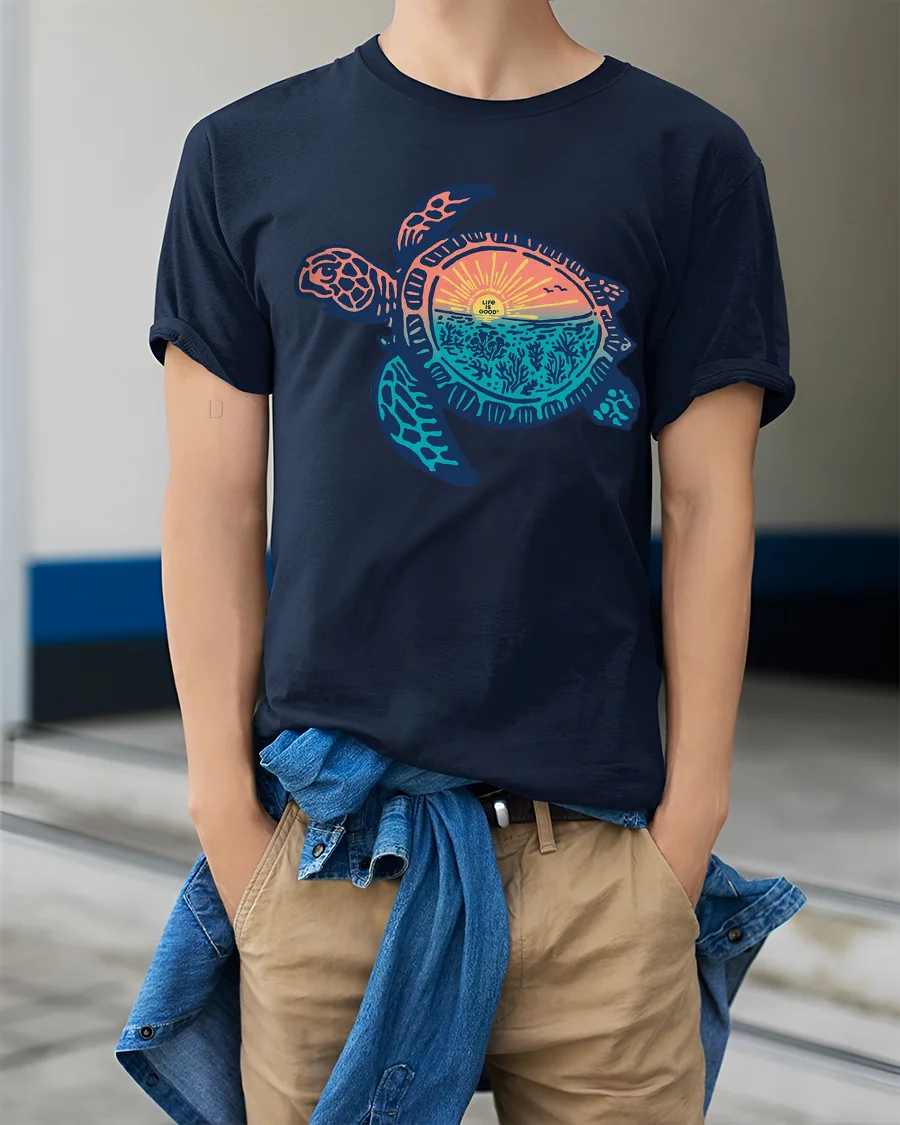 Sea Turtle Sunset Ocean Life Graphic Tee Coastal Aesthetic - model wearing navy tee with hands in pockets