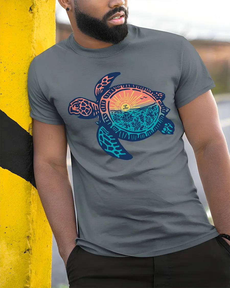 Sea Turtle Sunset Ocean Life Graphic Tee Coastal Aesthetic - model wearing grey tee, leaning on column