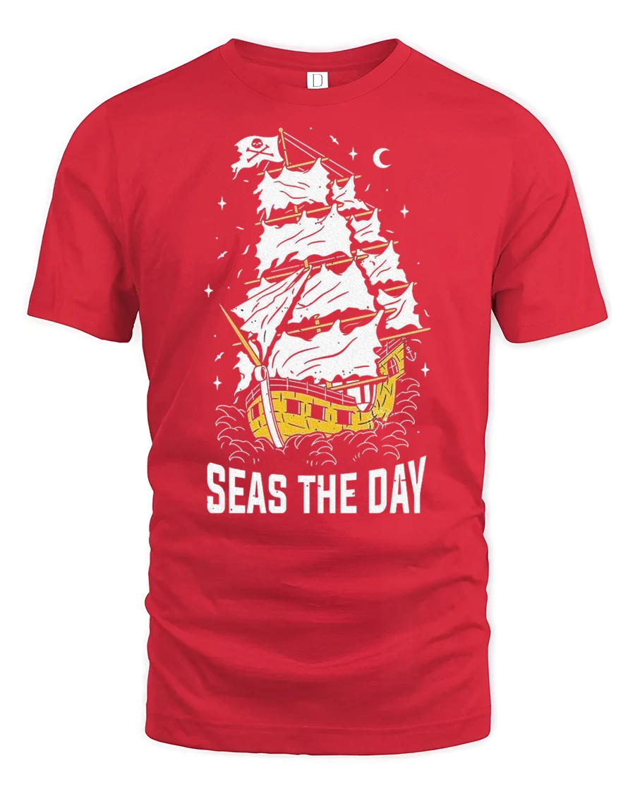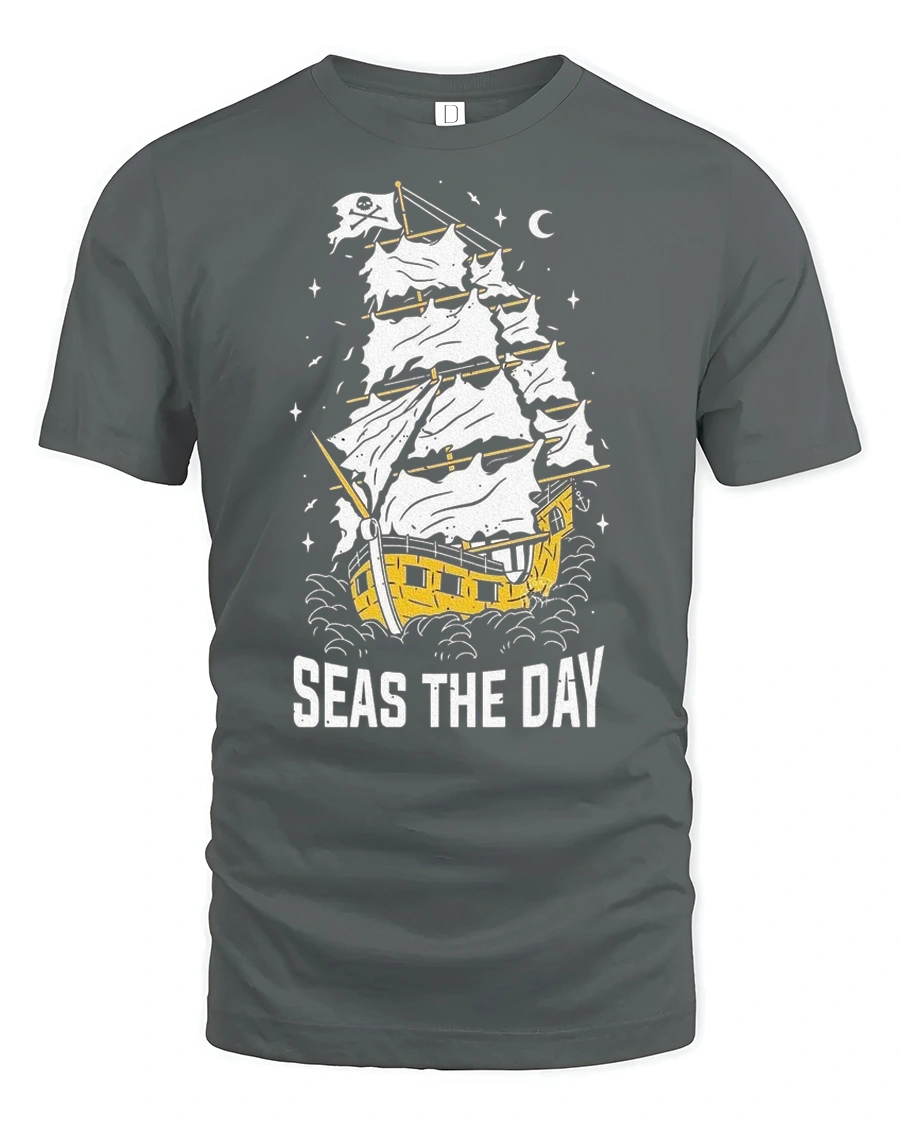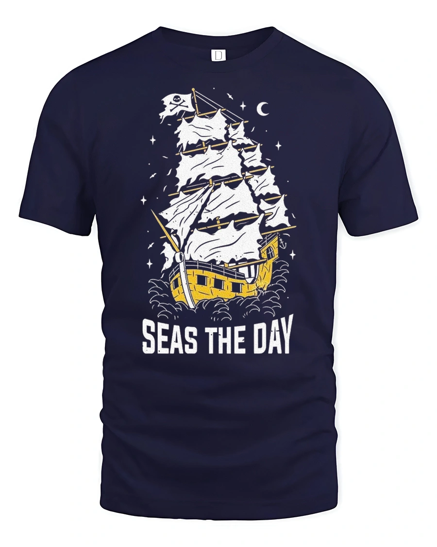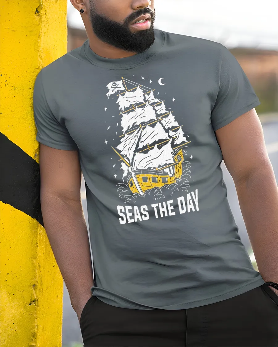 Seas The Day Pirate Ship Graphic Tee Funny Sailing Tshirt features a creative nautical illustration combined with a playful motivational phrase inspired by ocean adventure. The vintage style pirate ship artwork captures the spirit of exploration and freedom, delivering a bold yet fun visual design that stands out effortlessly. This imaginative concept brings together humor and maritime inspiration in a stylish graphic expression.