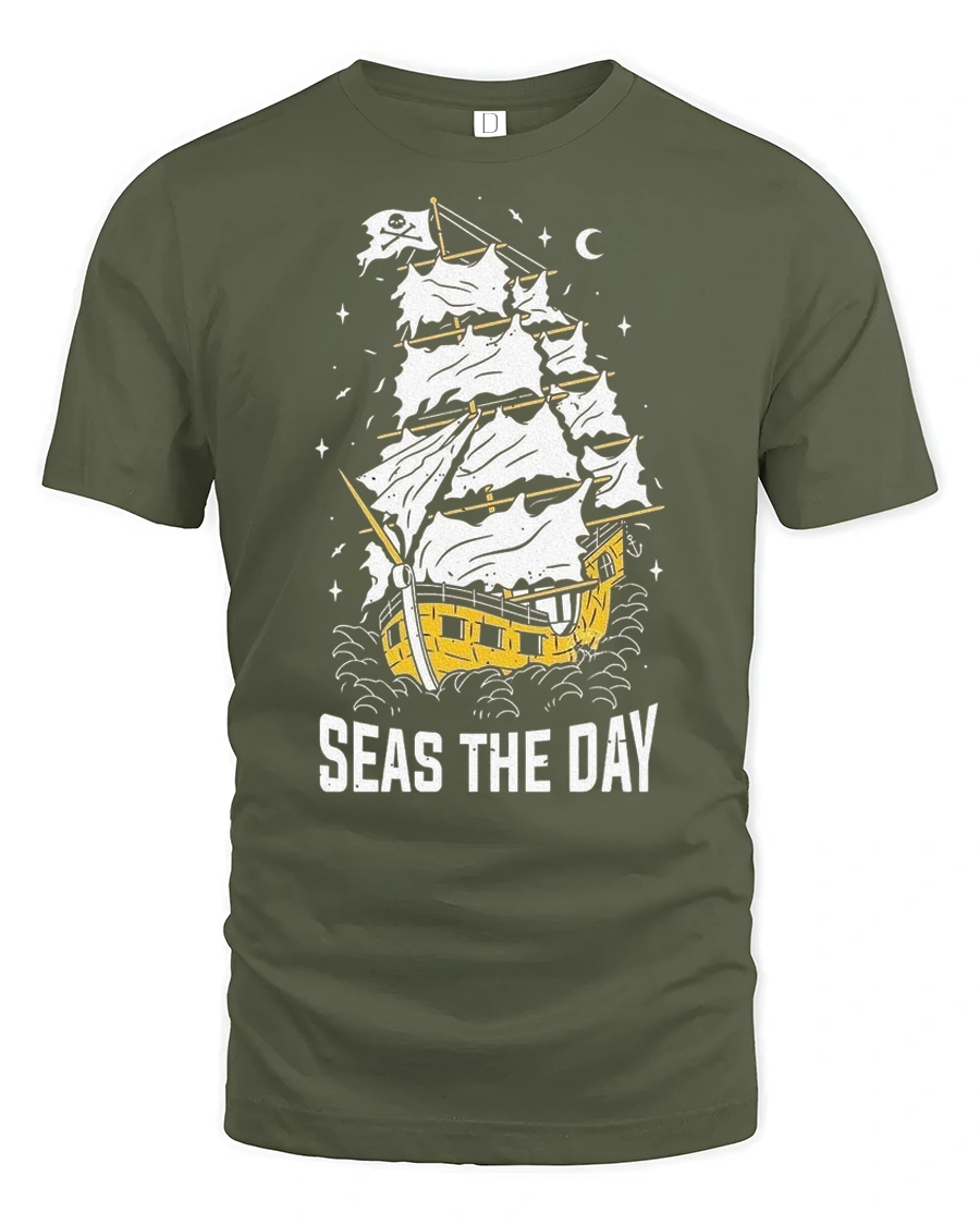 Seas The Day Pirate Ship Graphic Tee Funny Sailing Tshirt - military green t-shirt on white background