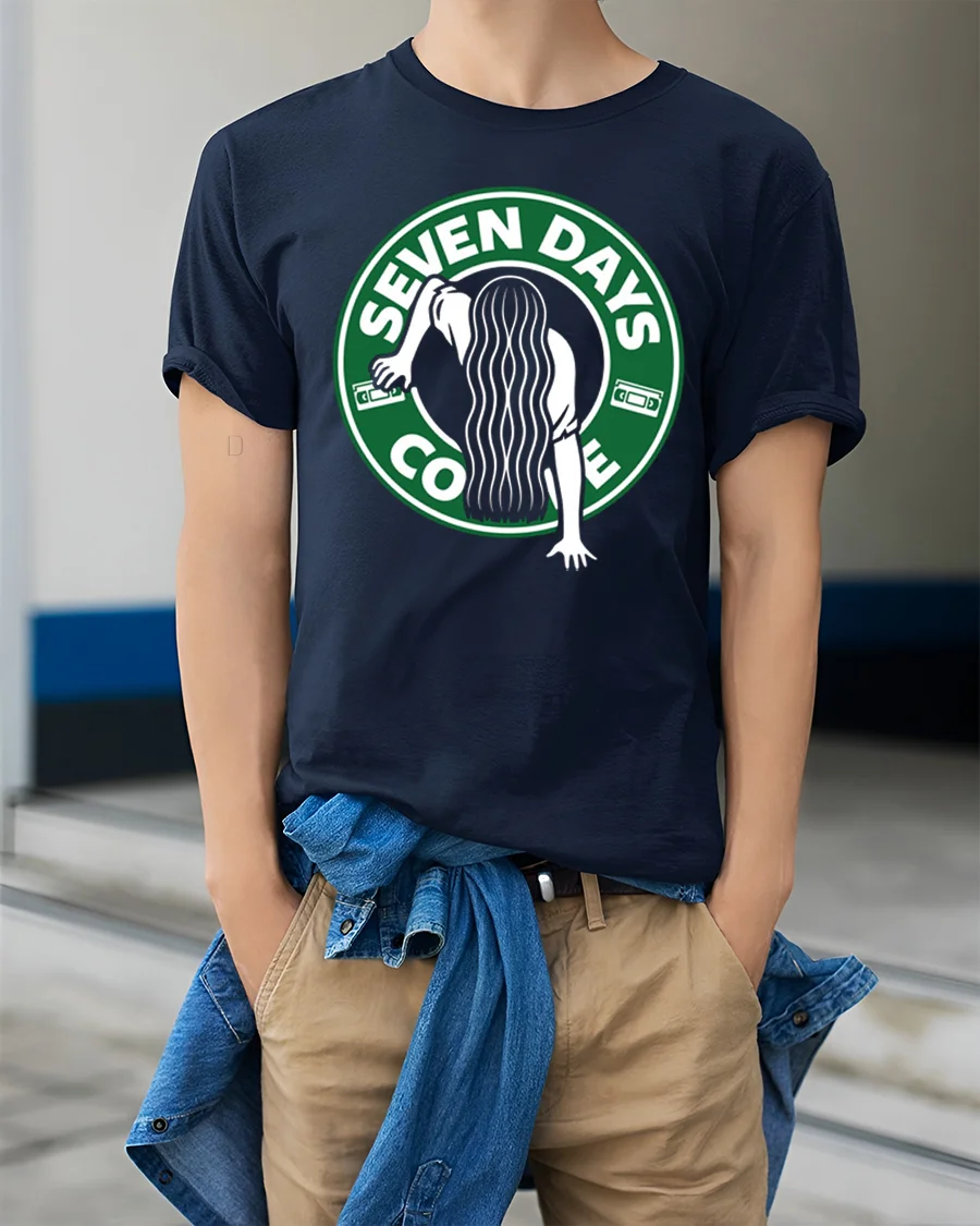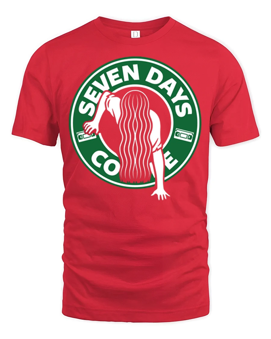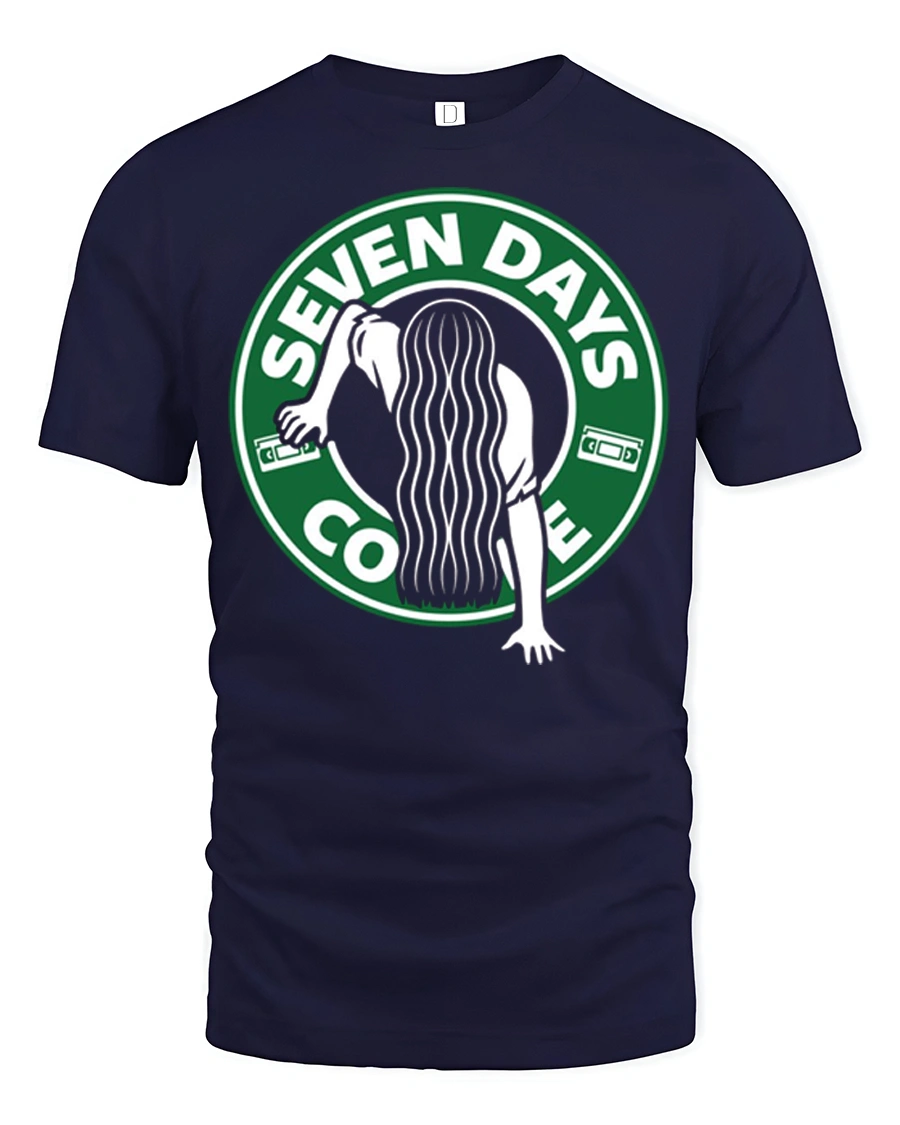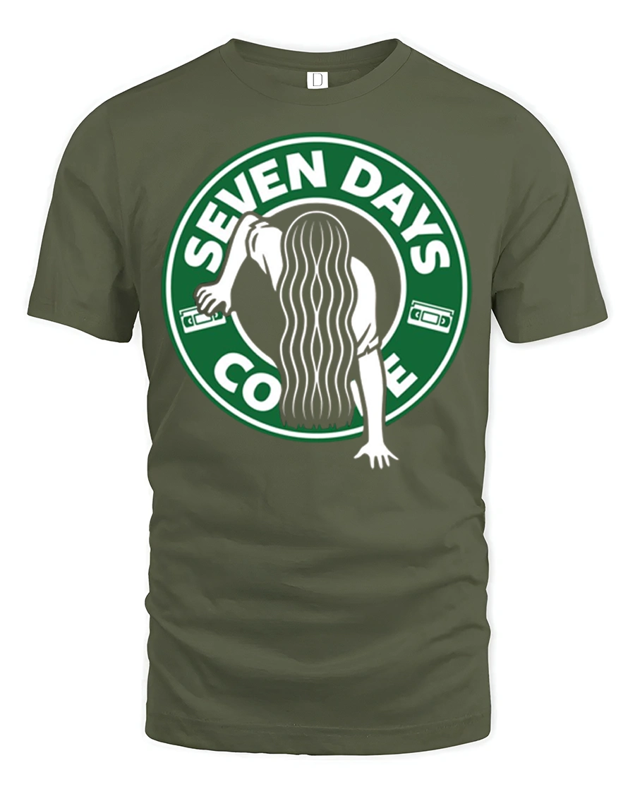 This seven days coffee horror parody graphic t shirt blends spooky humor with pop culture inspired design to create a fun and eye catching graphic. The artwork features a creepy silhouette climbing out of a coffee cup style logo with the phrase Seven Days Coffee, giving a clever twist that mixes horror movie vibes with coffee culture humor. The playful concept instantly grabs attention and delivers a fun spooky aesthetic that horror fans and humor lovers will appreciate.