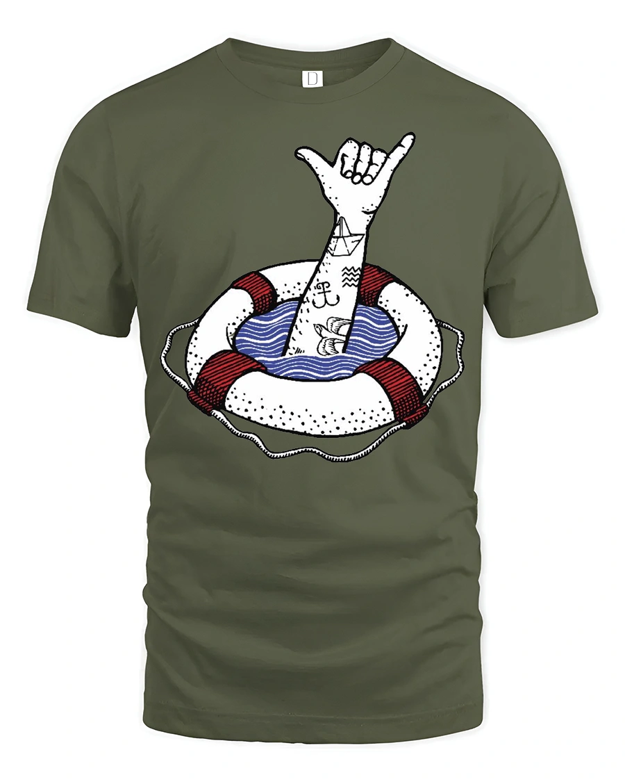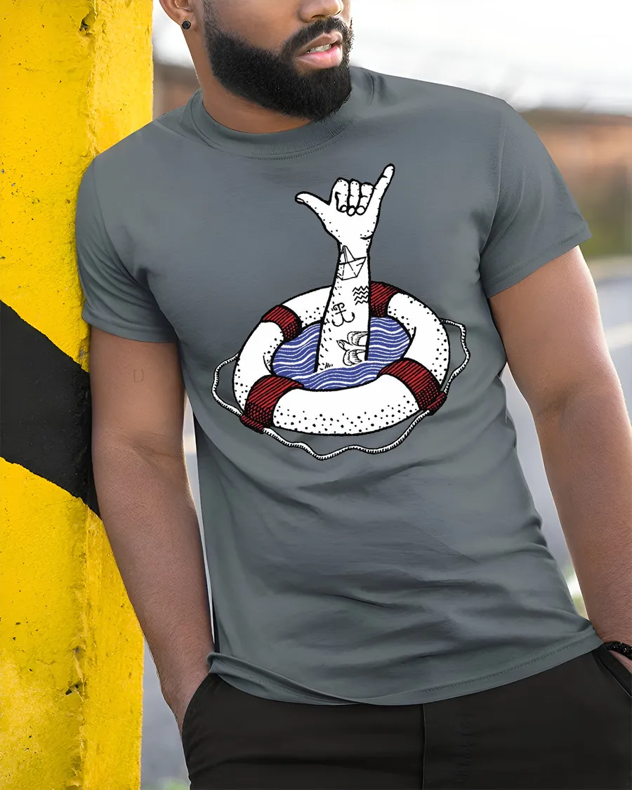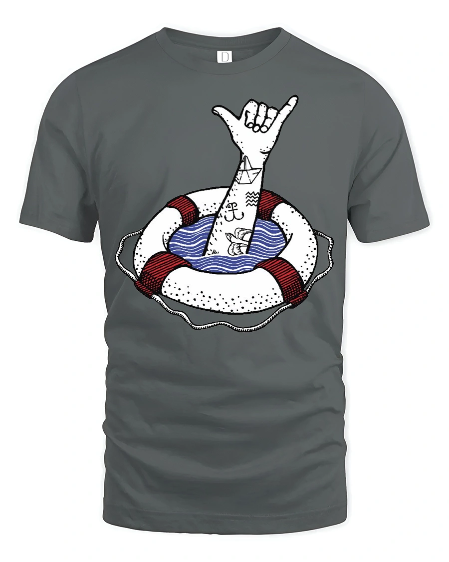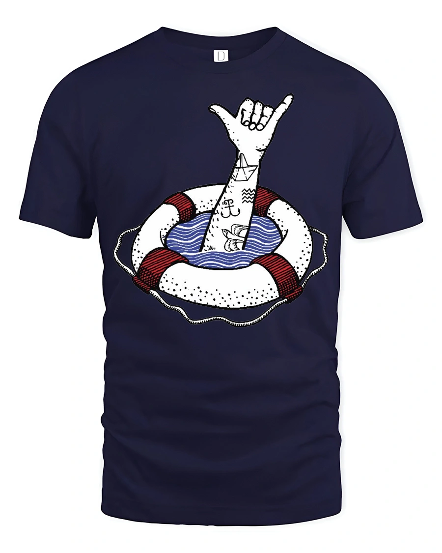 The Shaka Hand Lifebuoy Graphic Tee Beach Vibes Funny Tshirt offers a stylish expression of coastal creativity and laid back attitude.