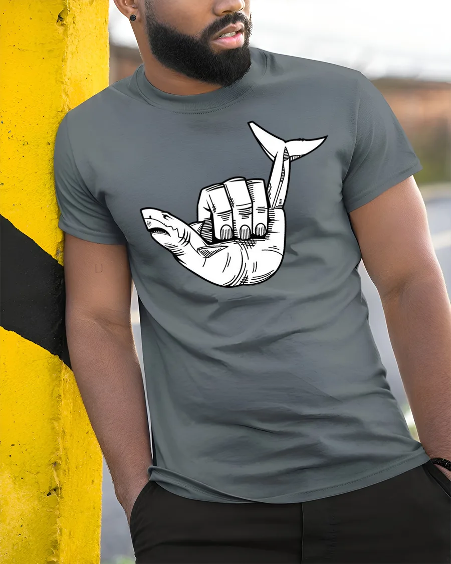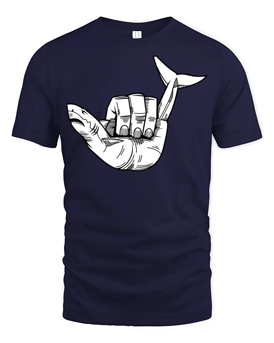 The unique design transforms a shark into a playful hand gesture, blending ocean vibes with a fun and edgy artistic style.