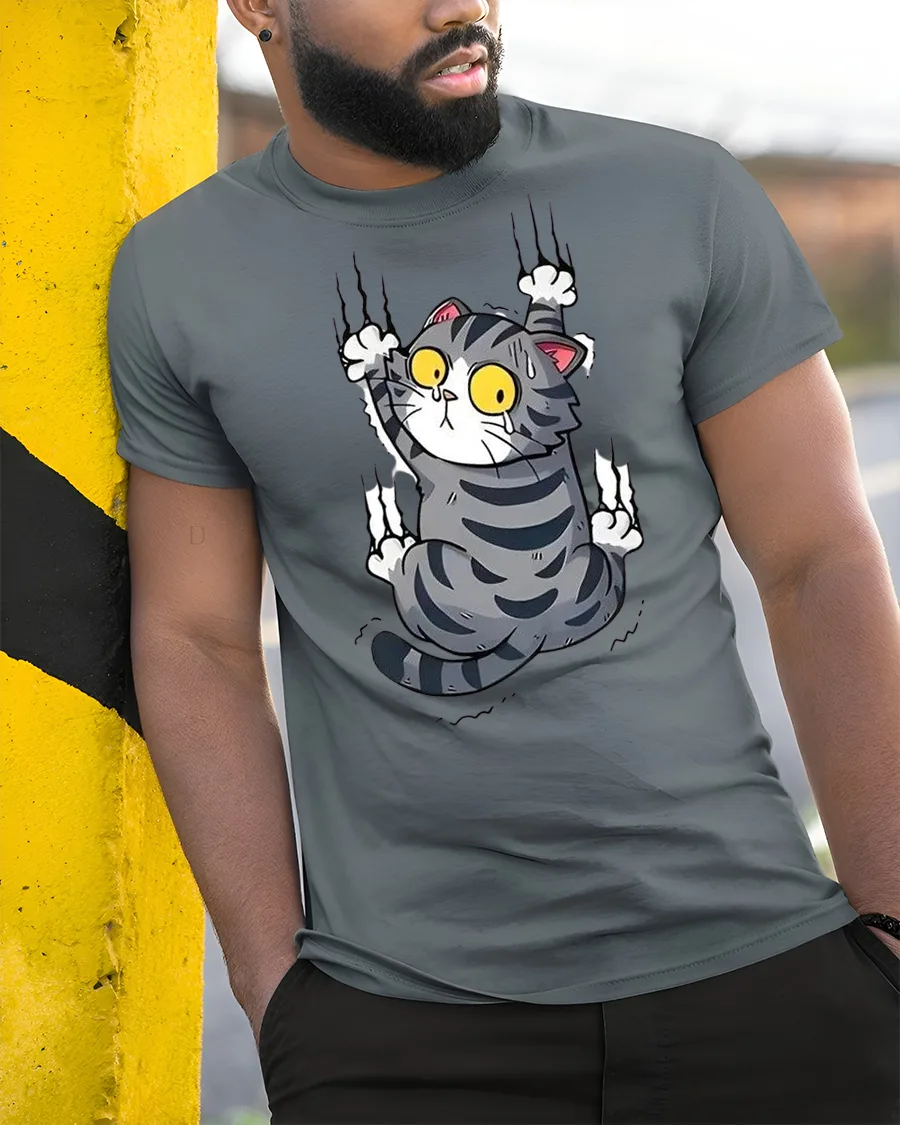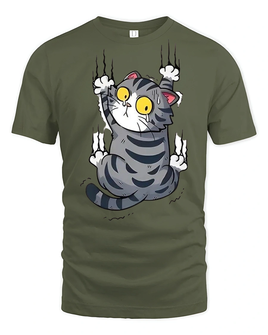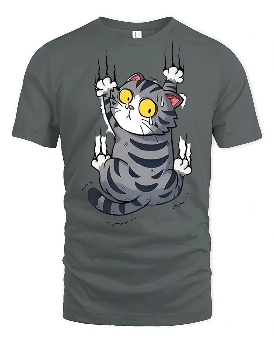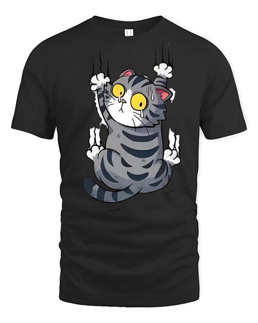 Silly Climbing Cat Wide Eyes Cute Cartoon Graphic Tee Shirt brings humor and personality to your everyday style.