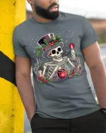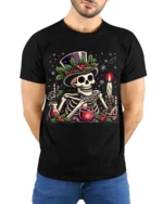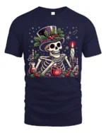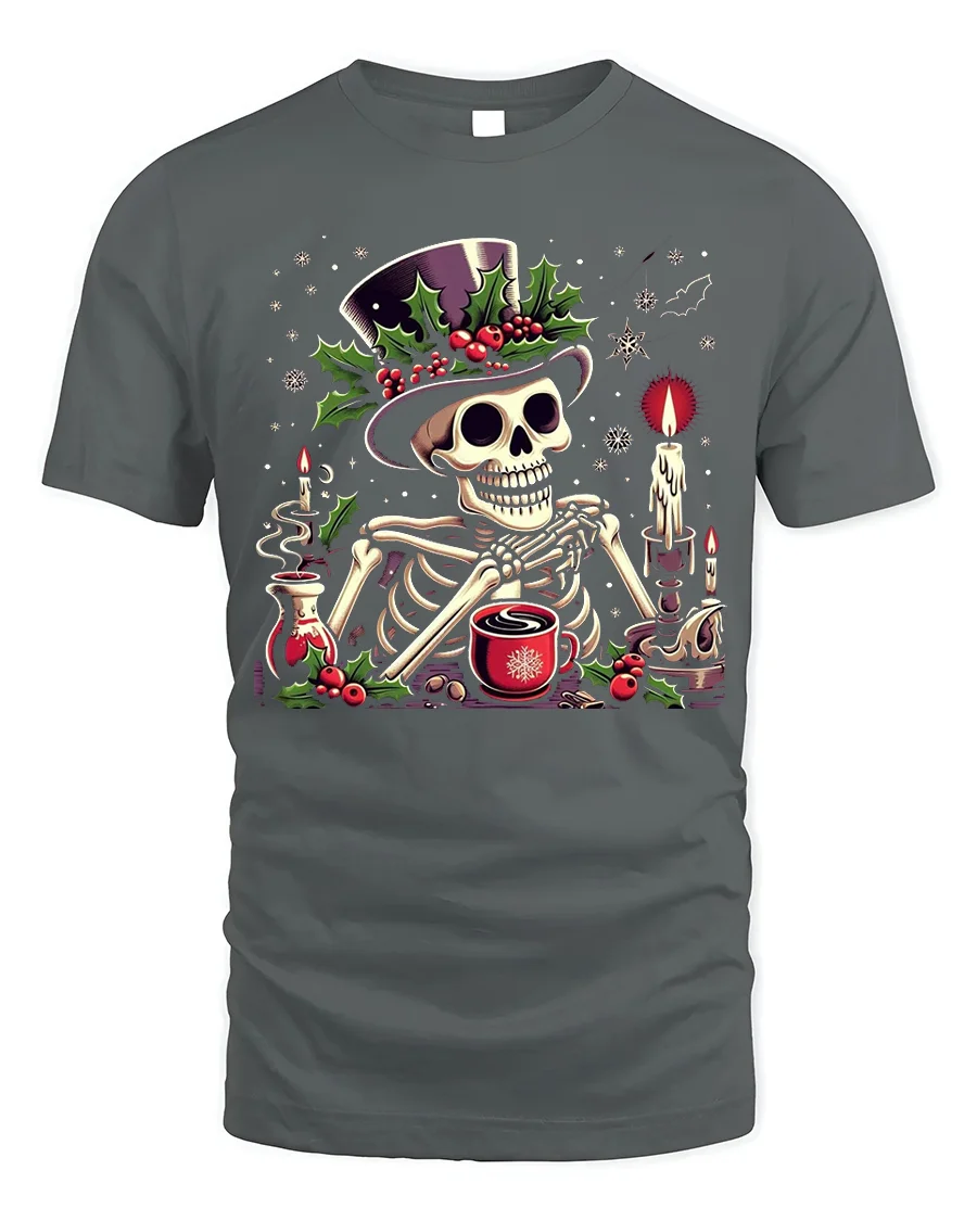 Celebrate the holidays with a unique twist in our Skeleton Christmas Coffee Candle Graphic T-Shirt. Designed for those who love a mix of spooky and festive, this shirt features a smiling skeleton enjoying coffee under candlelight, surrounded by holly and snowflakes. It’s a perfect way to blend Halloween charm with Christmas warmth.