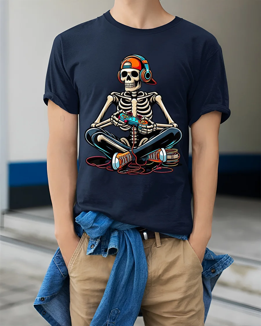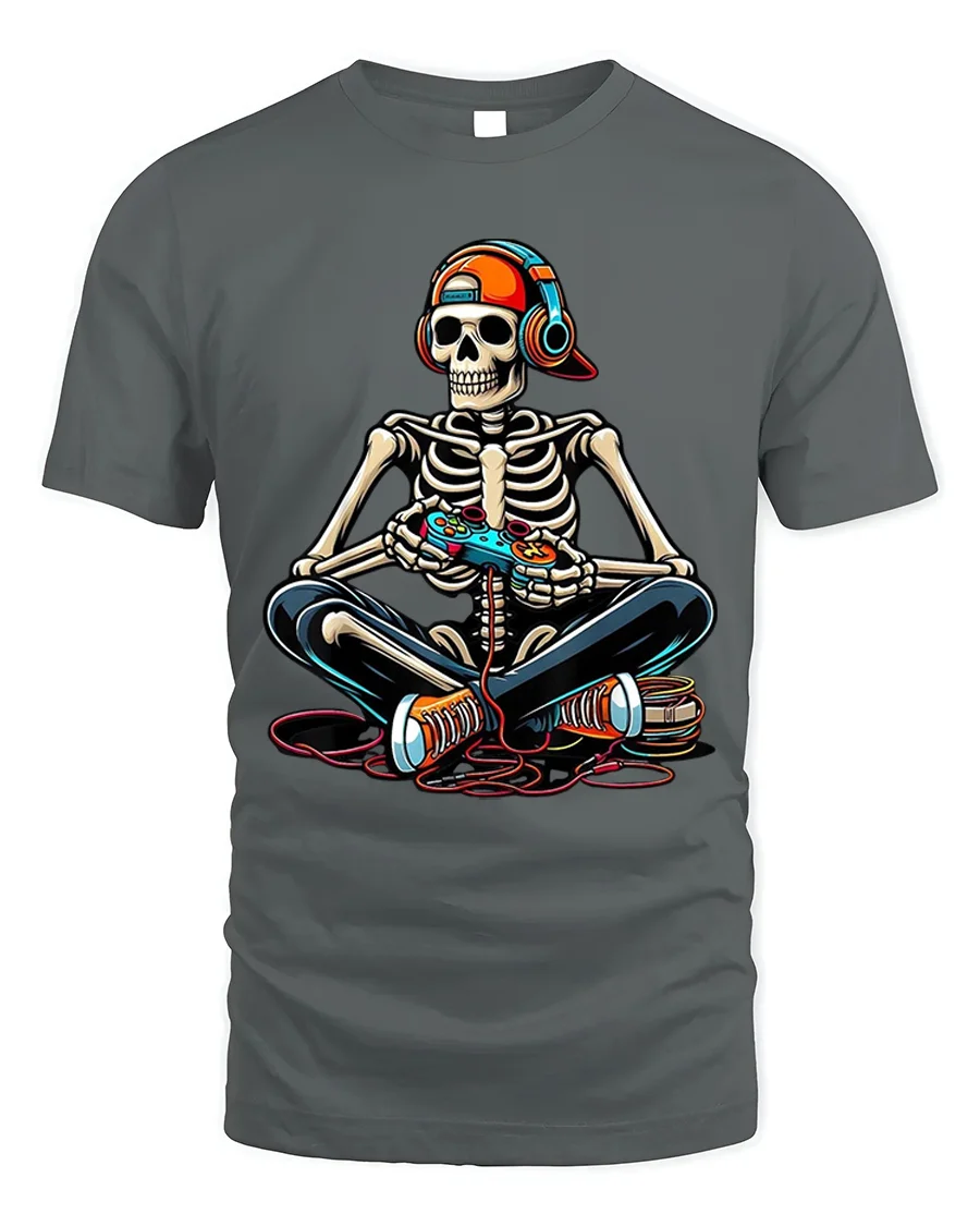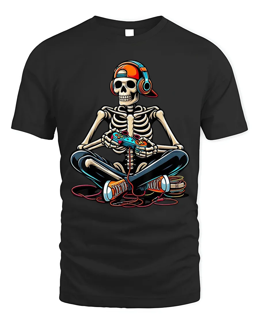 Featuring a relaxed skeleton wearing headphones and holding a game controller, this bold and humorous design perfectly captures the late-night gamer vibe.
