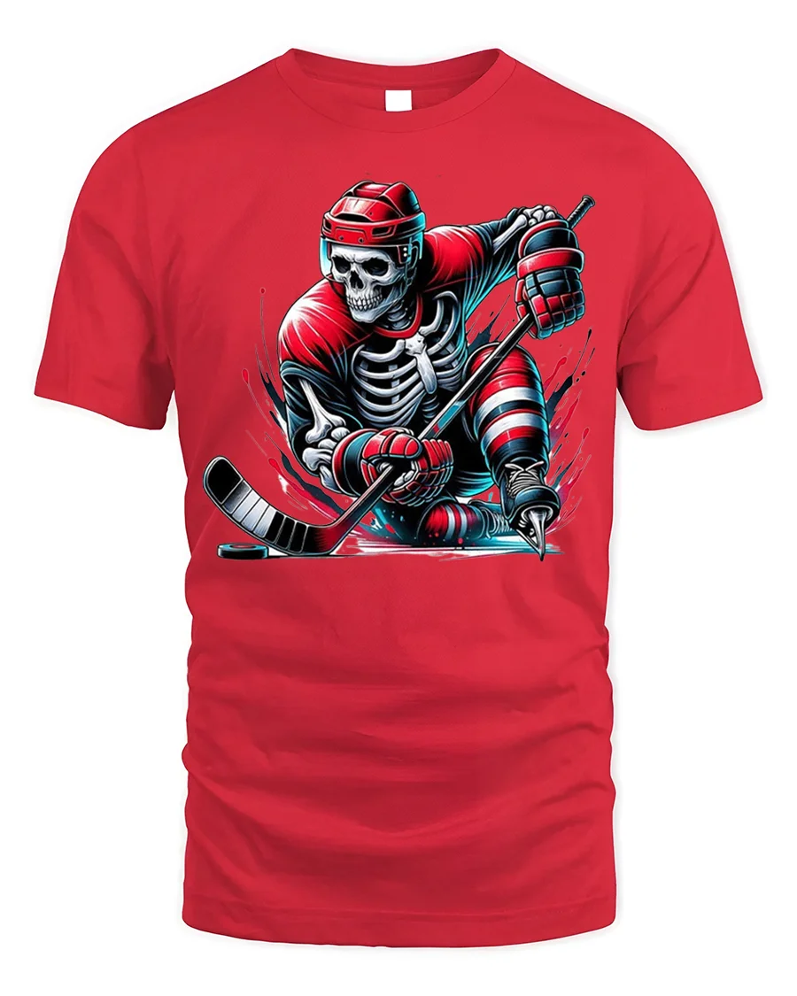 Bring intensity to the ice with the Skeleton Hockey Player Red Uniform Graphic T-Shirt. Featuring a striking design of a skeleton hockey player in full red gear, this bold graphic tee captures the raw energy and fearless spirit of the sport. With its mix of bone-chilling artwork and powerful motion, it’s the perfect shirt for hockey fans, players, or anyone who loves unique sports fashion.