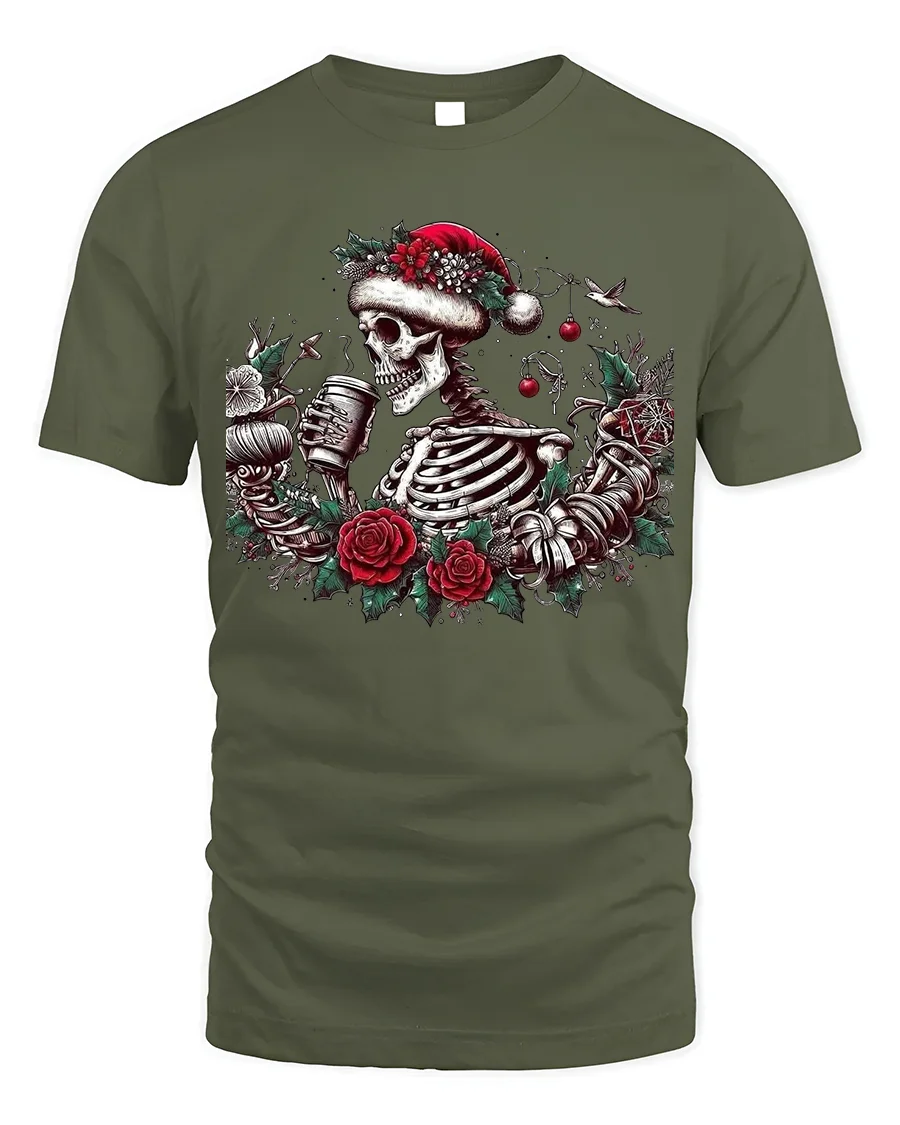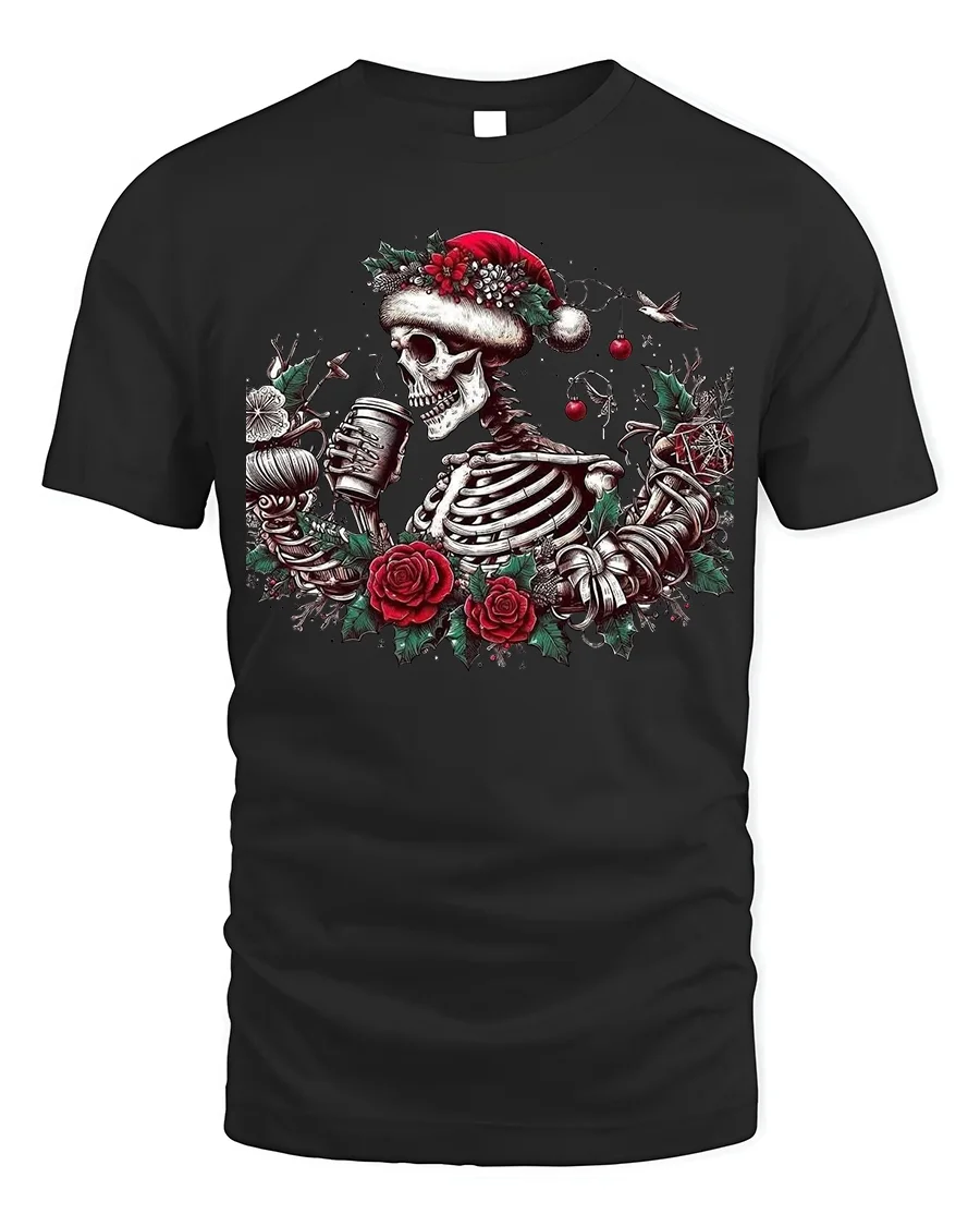 Skeleton Santa Hat Coffee T-shirt – Gothic Christmas Roses Tee