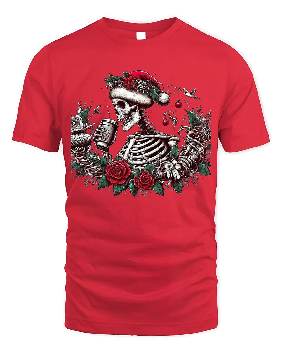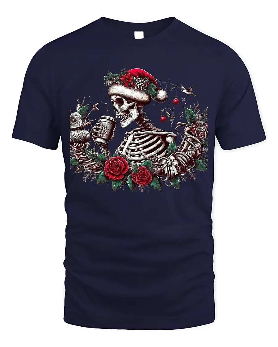 Embrace a blend of holiday cheer and unique style with our captivating Skeleton Santa Hat Coffee T-shirt! This striking tee features a detailed skeleton, adorned with a festive Santa hat and surrounded by beautiful red roses and holly, enjoying a cup of coffee. It’s a perfect design for those who love to celebrate the season with a touch of gothic elegance and a rebellious spirit. Made from soft, comfortable material, this t-shirt is ideal for both casual wear and making a bold holiday statement.
