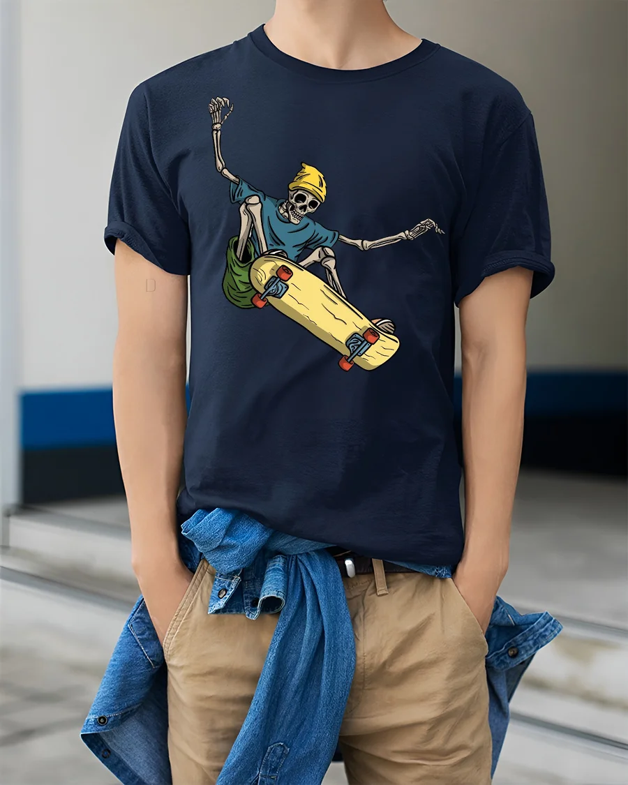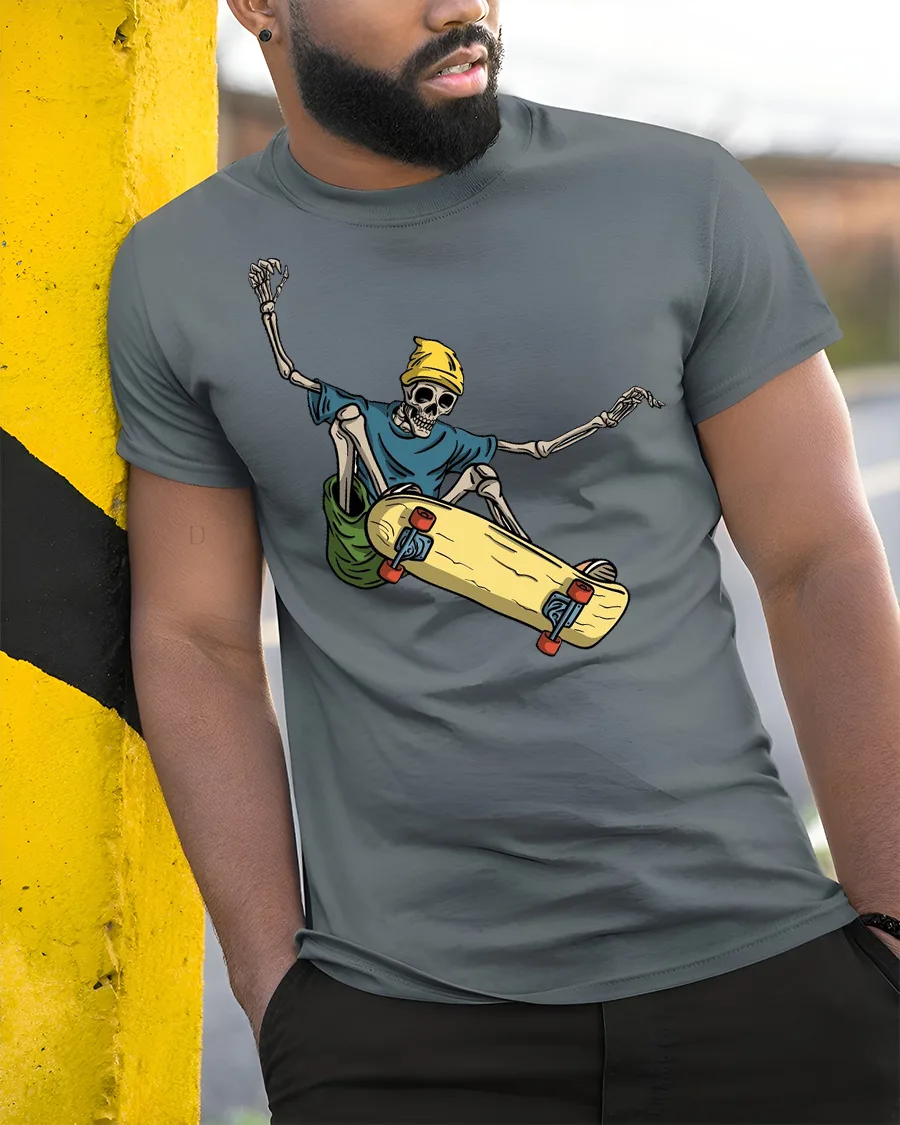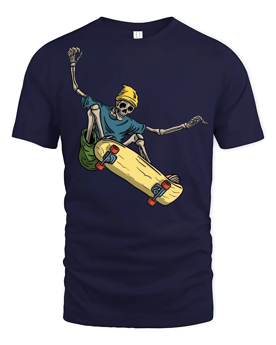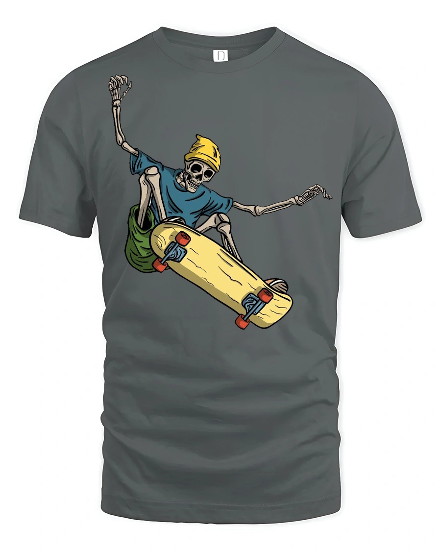 Featuring a skeleton performing a skateboard trick, this tee blends edgy style with a fun cartoon twist.