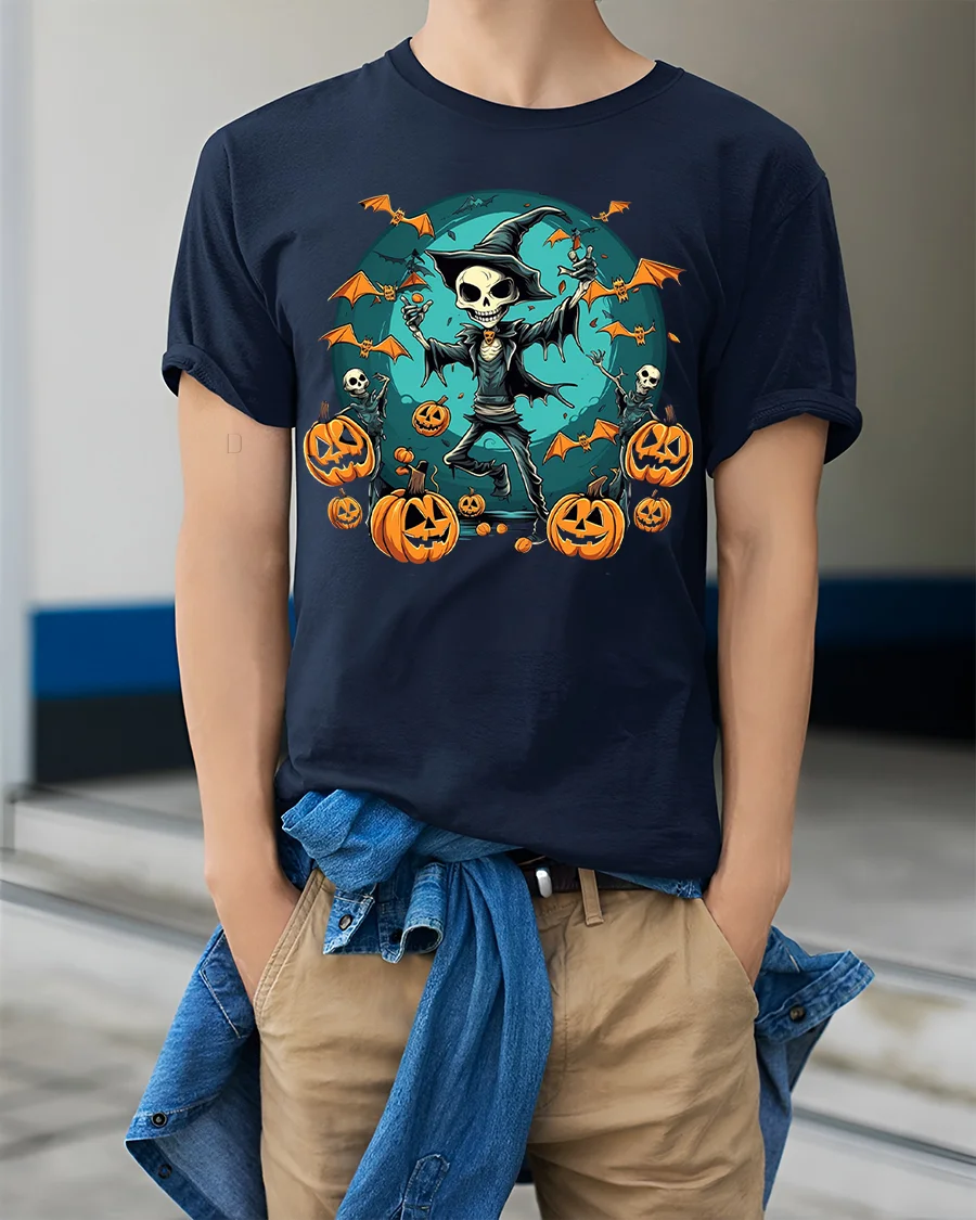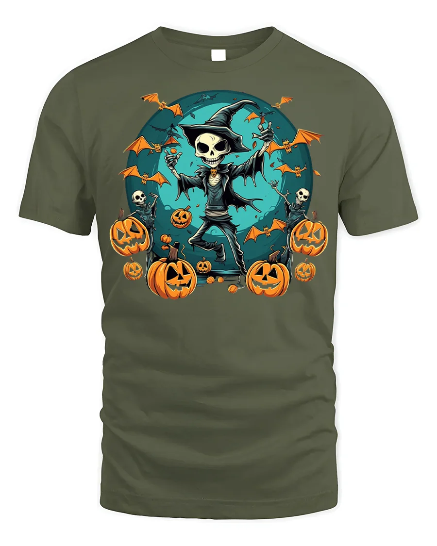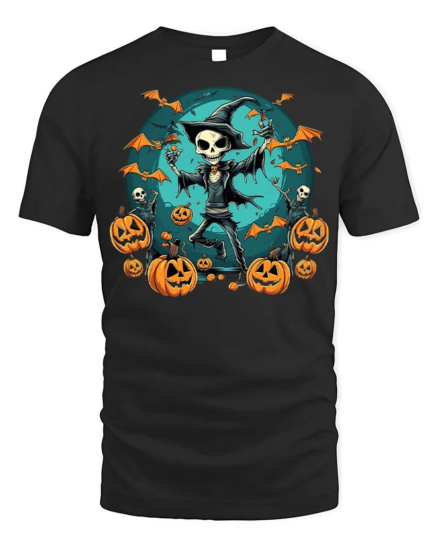 Bring a bold spooky vibe to your outfit with our Skeleton Witch Pumpkin Halloween Graphic T-Shirt, a perfect choice for Halloween lovers who want to stand out this season. Featuring a sinister skeleton witch surrounded by glowing jack-o’-lanterns, flying bats, and a bright full moon, this shirt captures the true spirit of Halloween in a creepy yet fun style.