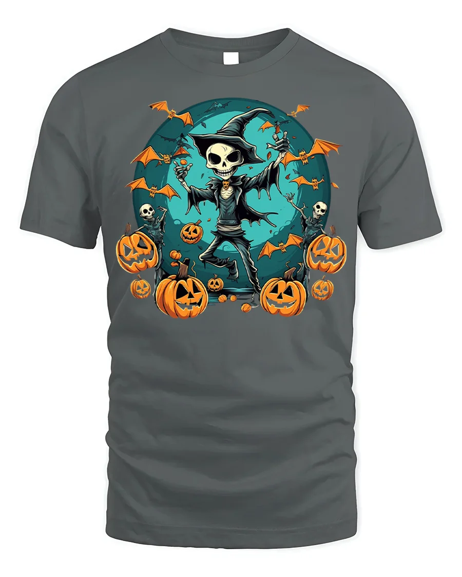 Celebrate the scariest time of year with our Skeleton Witch Pumpkin Halloween Graphic T-Shirt and let your spooky side shine bright under the full moon.