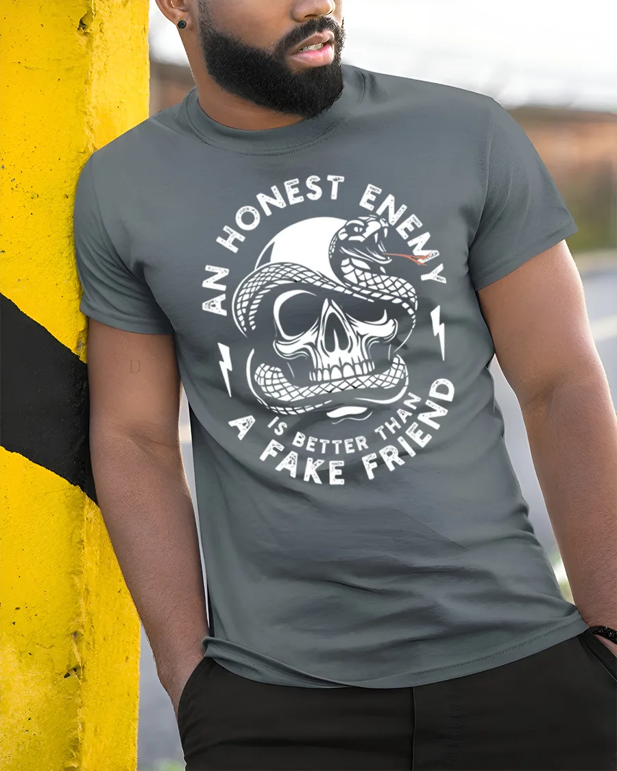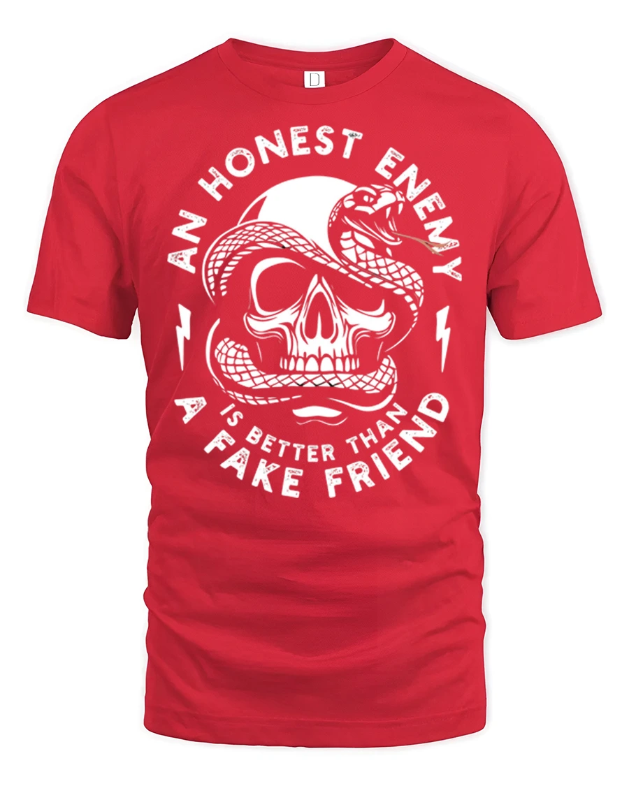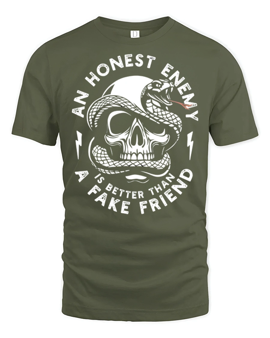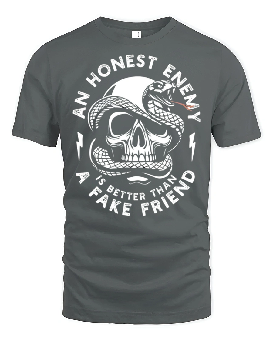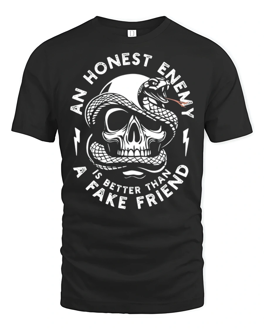 The Skull And Snake An Honest Enemy Quote Graphic T Shirt features a bold dark style design that combines powerful symbolism with a strong message about honesty and loyalty.