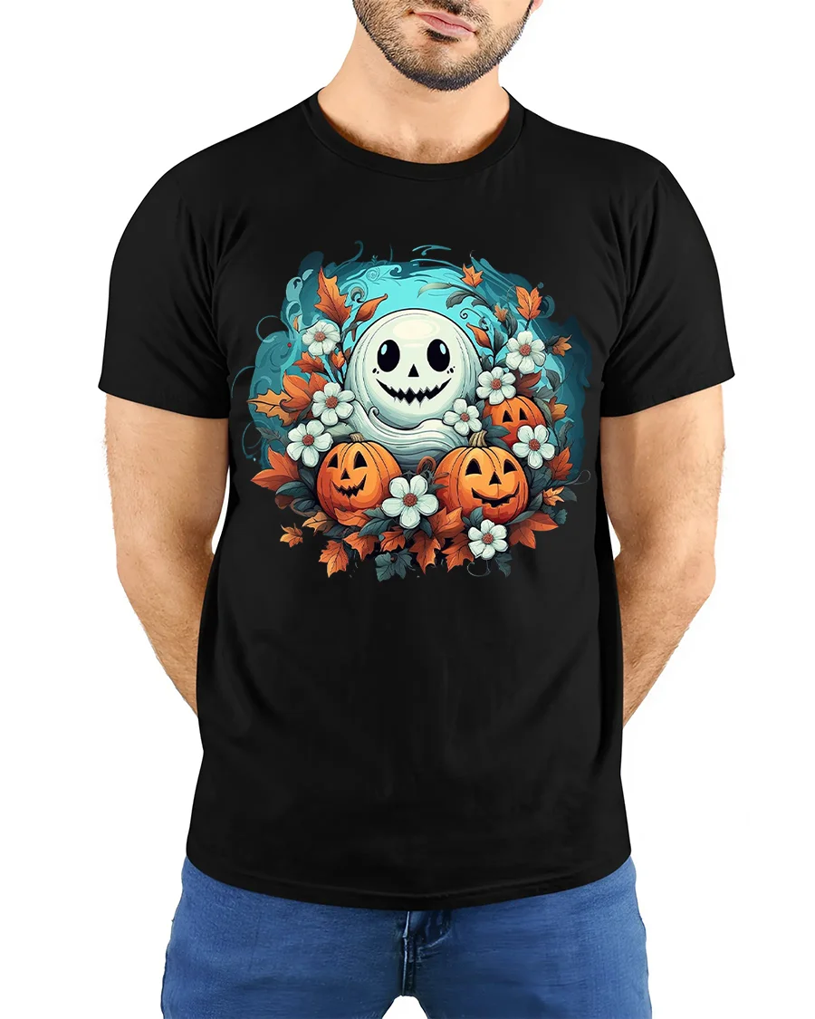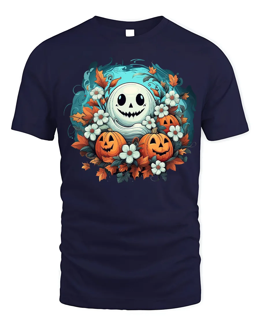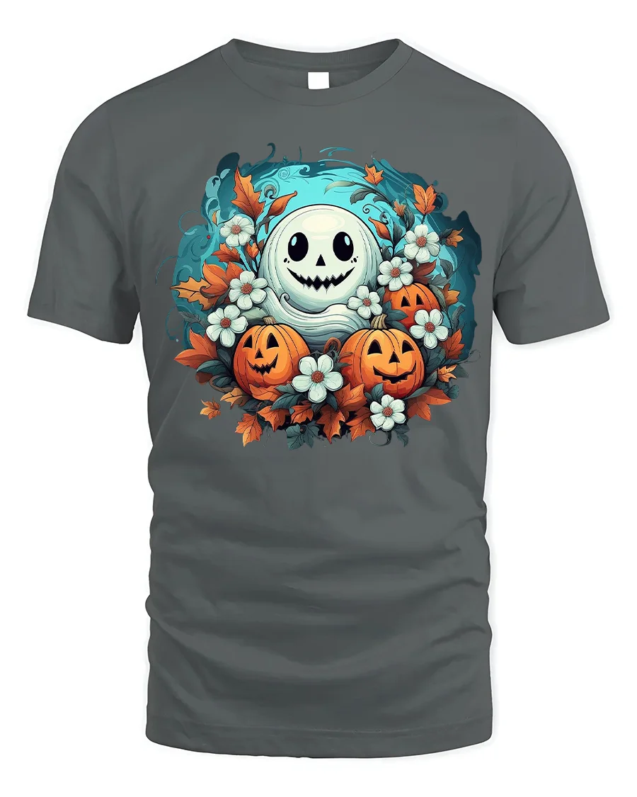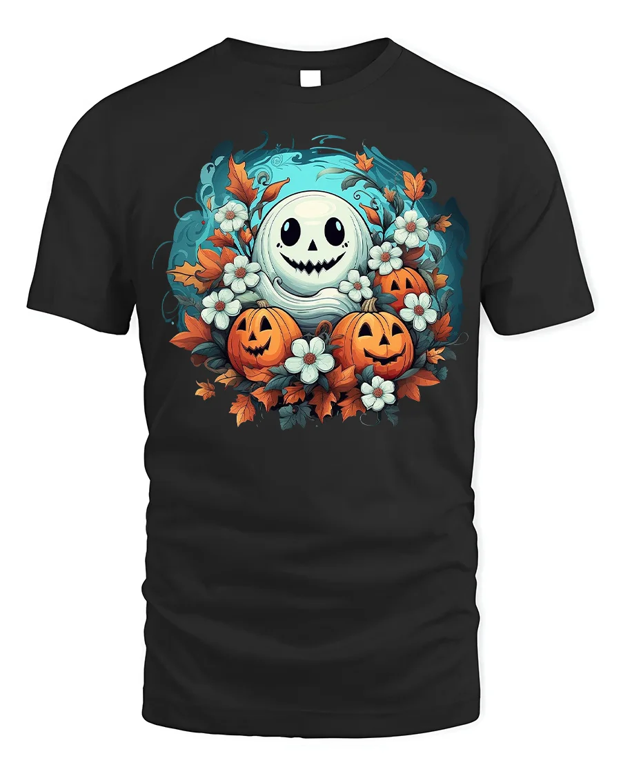 Bring a playful mix of spooky and festive charm to your wardrobe with this Smiling Ghost Pumpkin Floral Halloween T-Shirt, perfect for celebrating the magic of October. Featuring a cheerful ghost surrounded by glowing jack-o’-lantern pumpkins, fall leaves, and delicate floral accents, this design blends the eerie spirit of Halloween with the warmth of autumn beauty. The artwork captures both the fun and whimsical side of the season, making it a great choice for all Halloween enthusiasts.