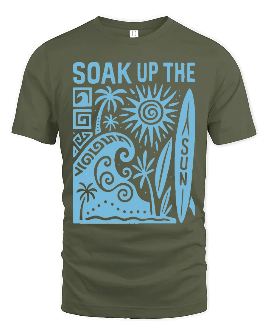 Soak Up The Sun Retro Surf Beach Vibes Graphic Tee Tshirt captures the relaxed energy of coastal living through an artistic composition inspired by ocean waves warm sunshine and surf culture creativity.
