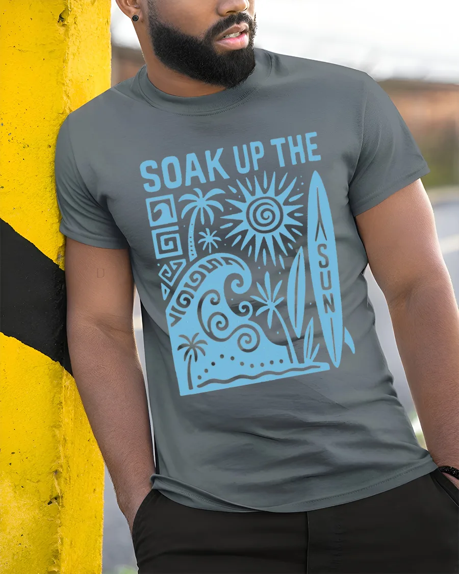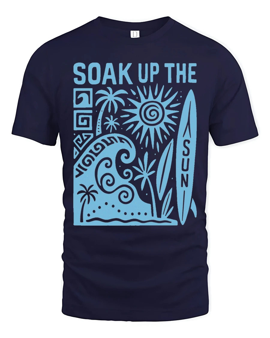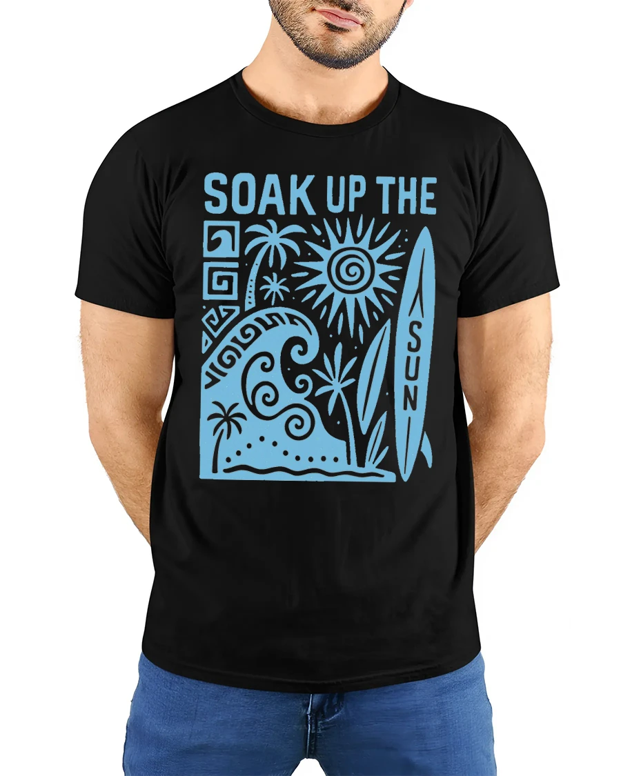 Ideal for individuals who enjoy beach travel ocean scenery and surf culture inspiration this soak up the sun tshirt design communicates positive mood and relaxed personality.