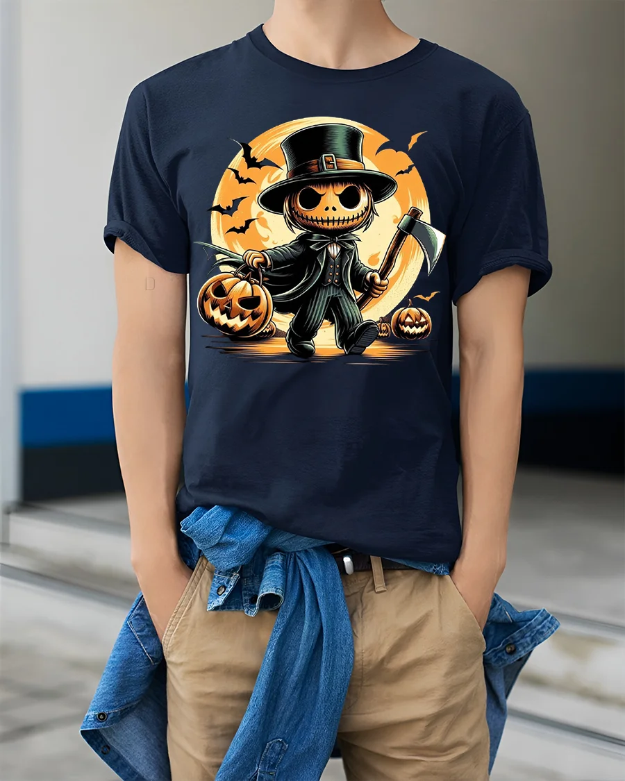 Spooky Pumpkin Axe Halloween Tshirt Costume Style - model wearing navy shirt, hands in pockets