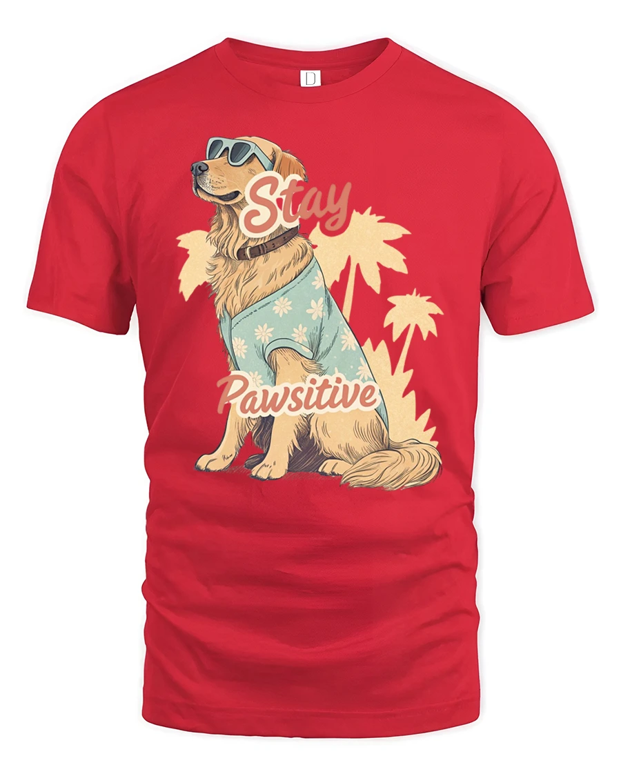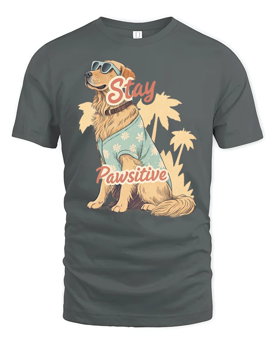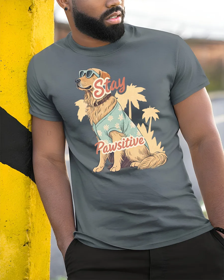 The artwork features a stylish golden retriever wearing sunglasses and a cute shirt, sitting confidently with palm trees in the background while the playful phrase Stay Pawsitive adds an uplifting message.
