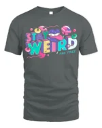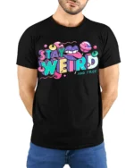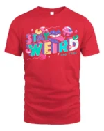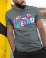 Featuring a vibrant and playful design with bold letters, candy colors, and funky cartoon elements, this tee reminds you to embrace your weird side and live life freely.