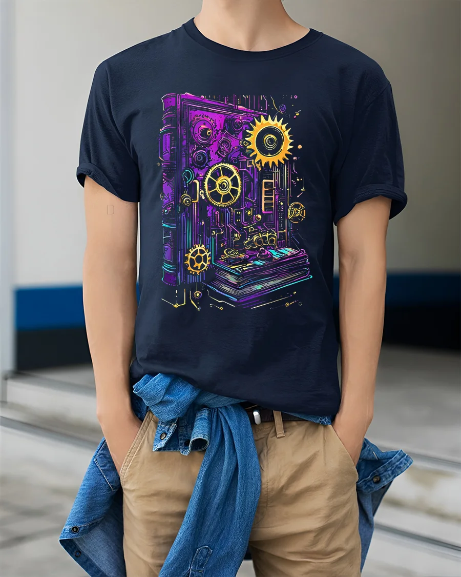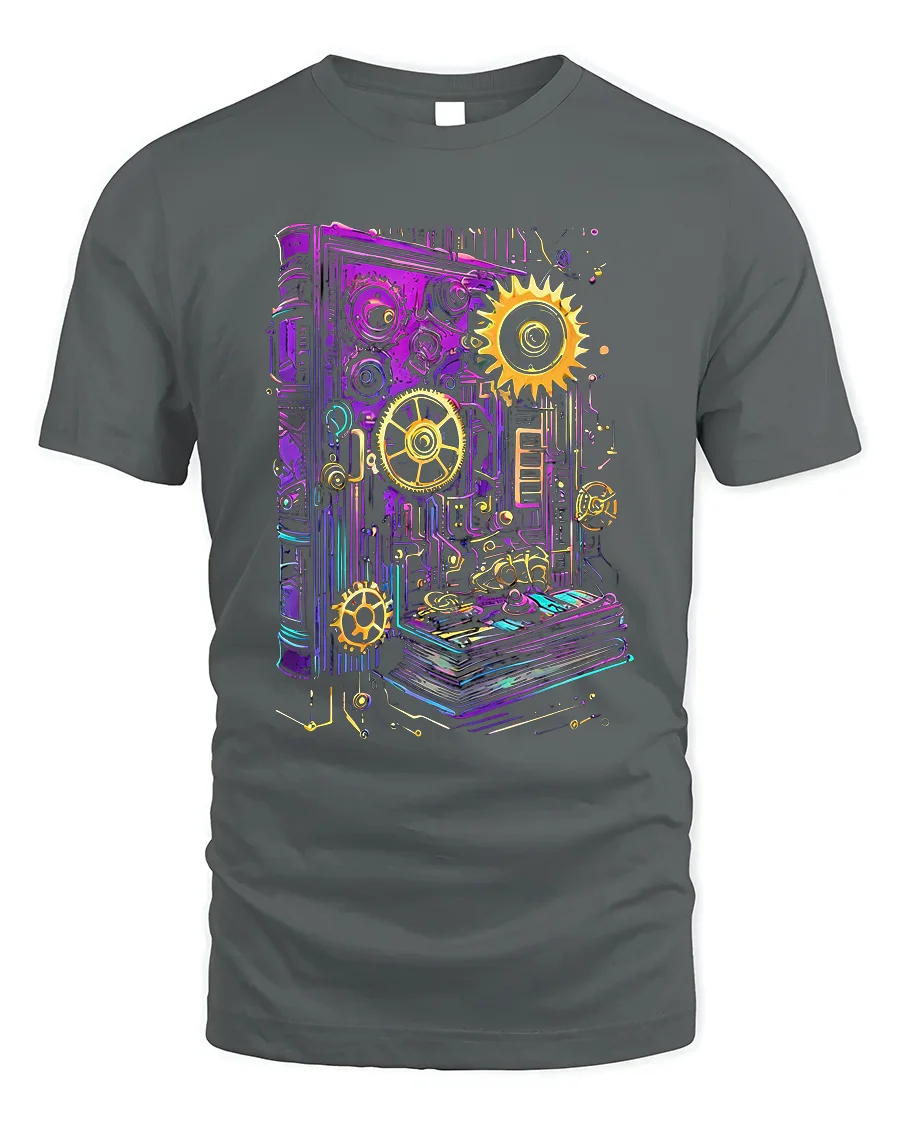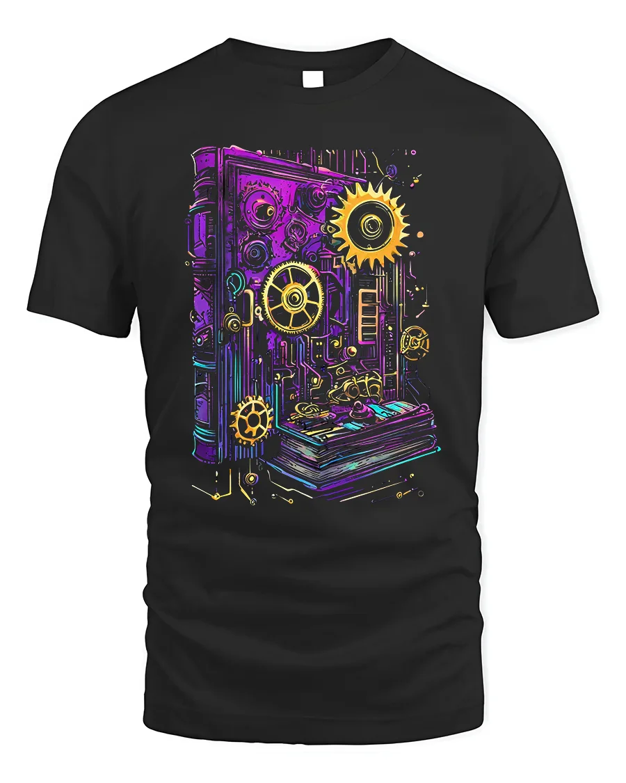 Crafted for comfort and durability, this t-shirt is ideal for everyday wear, casual outings, or as a conversation starter at conventions. The detailed graphic showcases a stack of books intricately connected with gears and circuits, embodying a fusion of knowledge and innovation. This mechanical design tee is a fantastic way to express your personality and passion for inventive aesthetics. Made with high-quality material, this shirt offers a soft and comfortable feel, ensuring you look great and feel good.