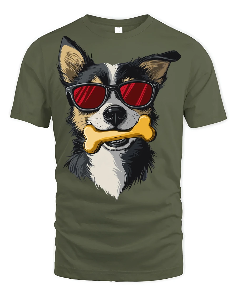 Stylish Dog Wearing Shades With Bone Fun Graphic Tee Shirt - military green t-shirt on white background