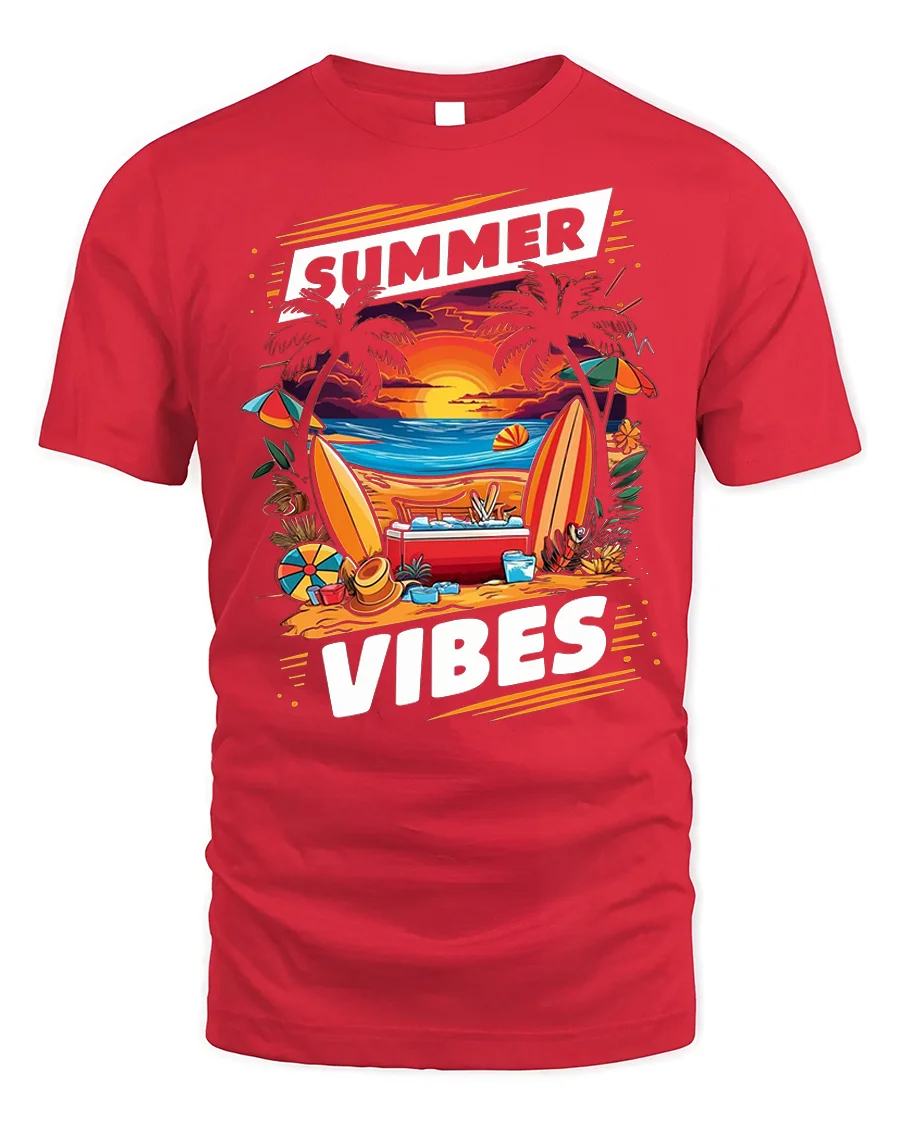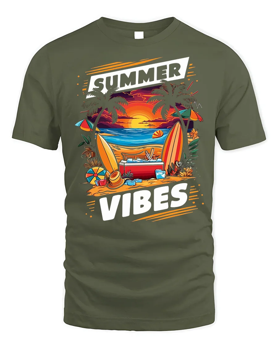 Embrace the season with the Summer Vibes Beach Sunset Surfing T-Shirt—a comfortable, stylish, and colorful design that celebrates everything you love about summer.