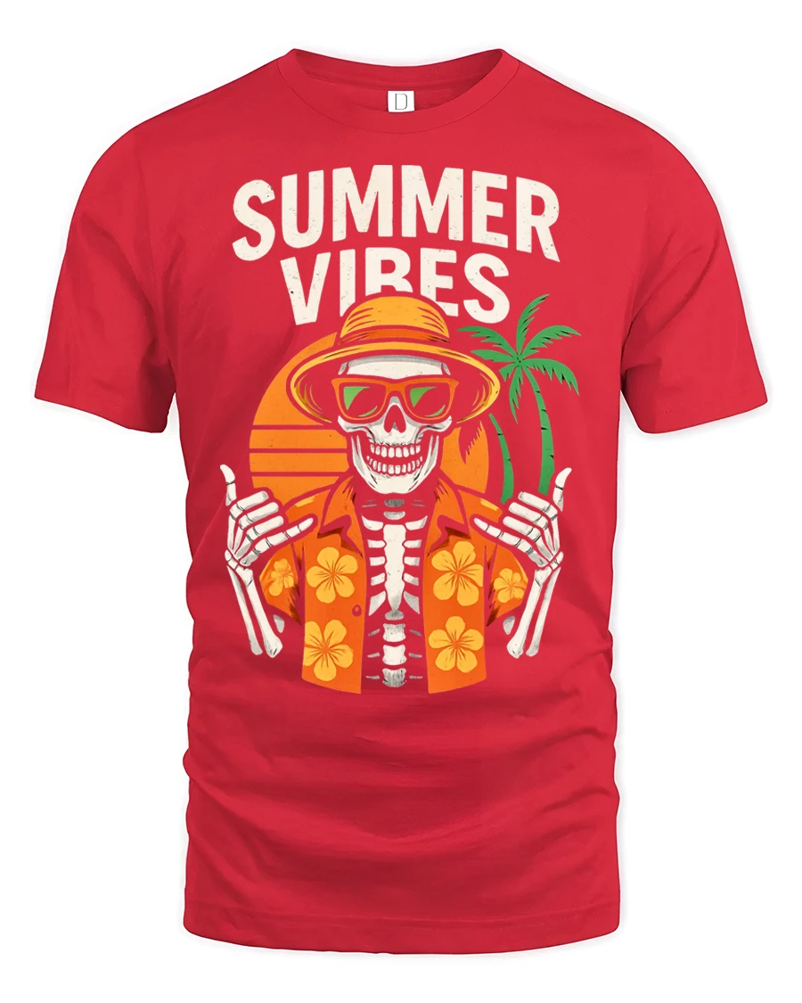 Summer Vibes Skeleton T Shirt Funny Tropical Skull Beach Graphic - red t-shirt on white background