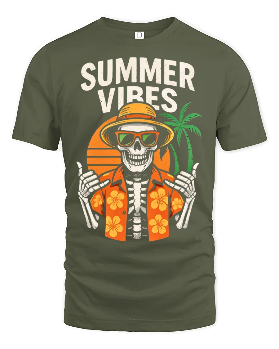 Summer Vibes Skeleton T Shirt Funny Tropical Skull Beach Graphic - military green t-shirt on white background
