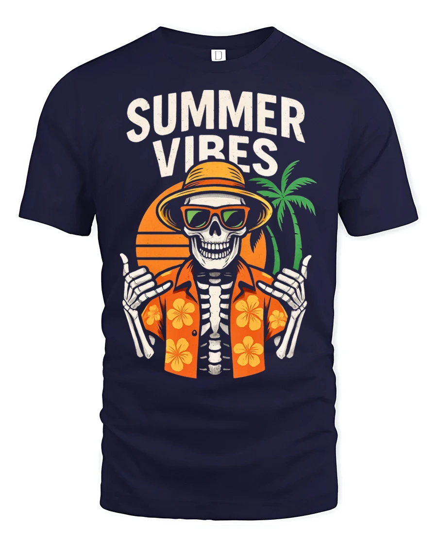 Summer Vibes Skeleton T Shirt Funny Tropical Skull Beach Graphic - navy t-shirt on white background