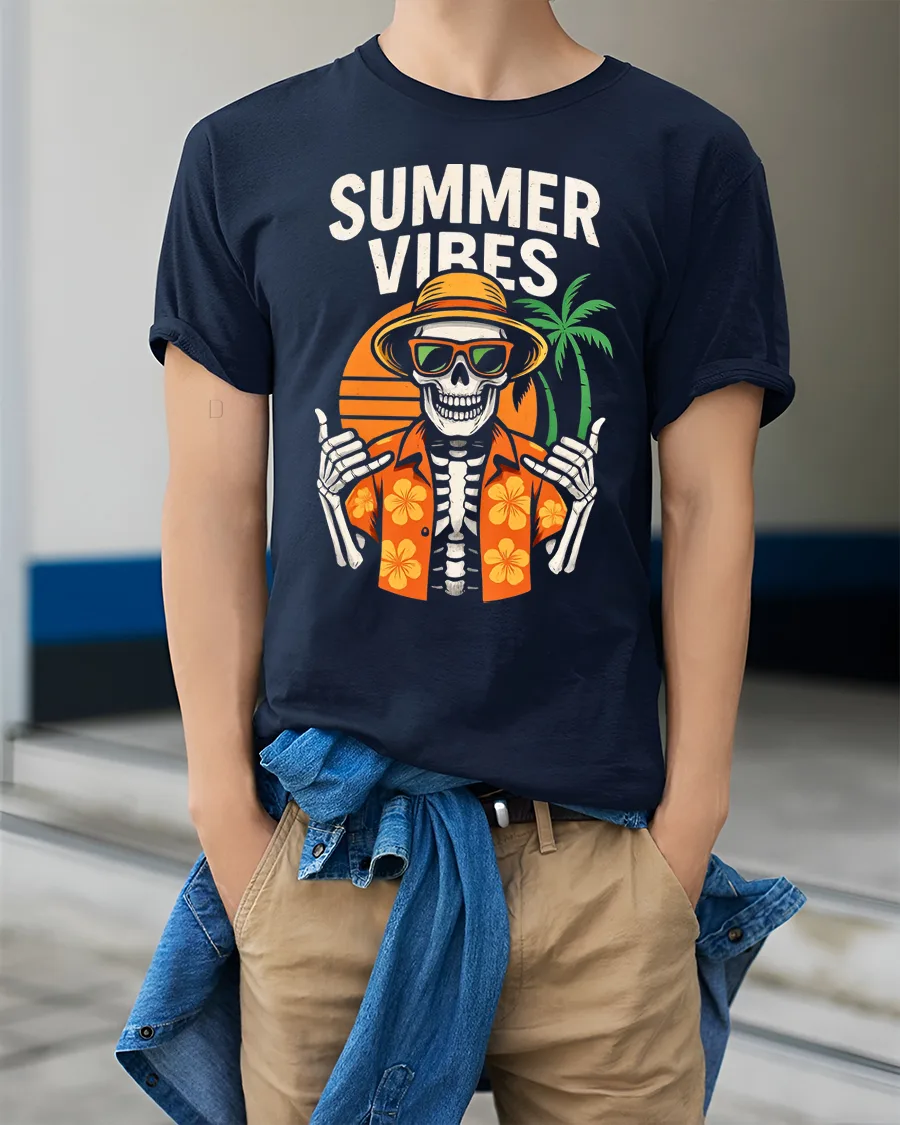 Summer Vibes Skeleton T Shirt Funny Tropical Skull Beach Graphic - model wearing navy tee with hands in pockets