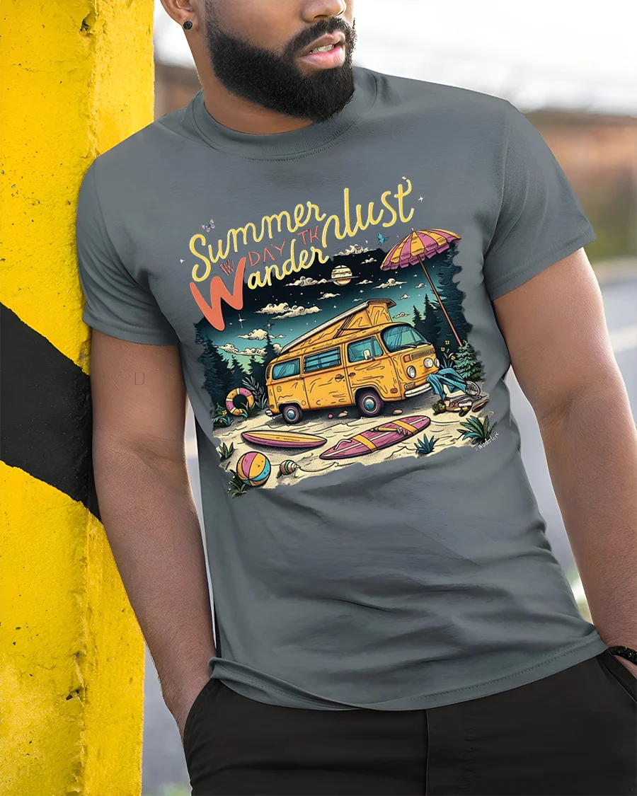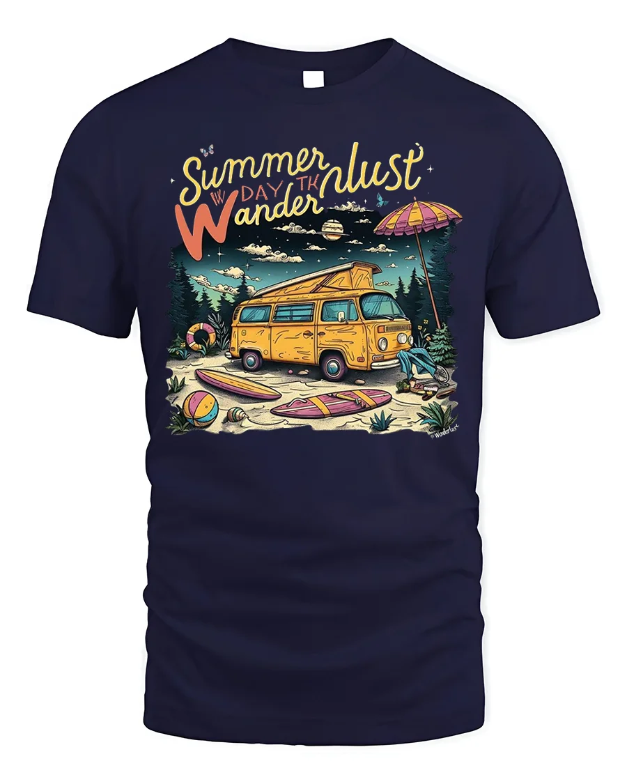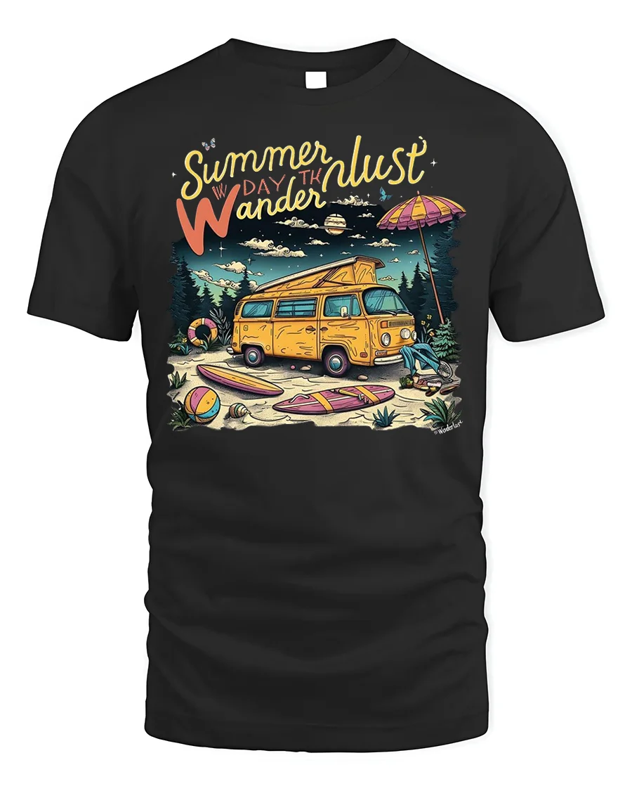 The Summer Wanderlust Beach Van Graphic T-Shirt also makes a thoughtful gift for travelers, surfers, campers, or free spirits who want to show off their love for adventure and the outdoors. Whether you’re cruising along the coast or chilling at a bonfire, this shirt is a stylish reminder that summer is all about exploration, relaxation, and making memories.