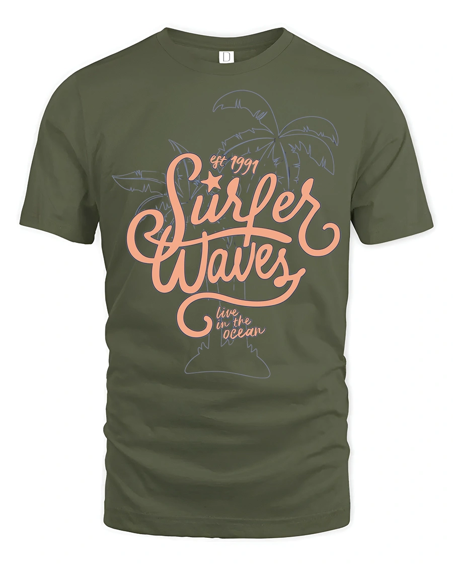 Surfer Waves Retro Beach Graphic Tee Ocean Lifestyle Style - military green t-shirt on white background