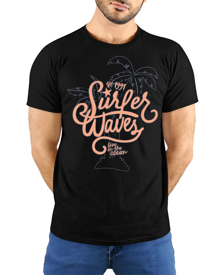 Surfer Waves Retro Beach Graphic Tee Ocean Lifestyle Style - model wearing black tee with hands behind back