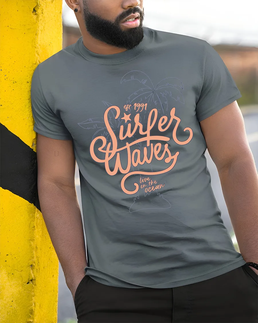 Surfer Waves Retro Beach Graphic Tee Ocean Lifestyle Style - model wearing grey tee, leaning on column