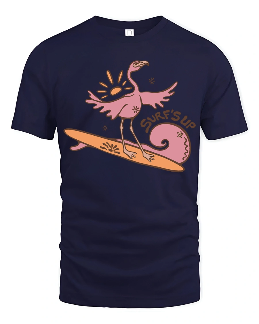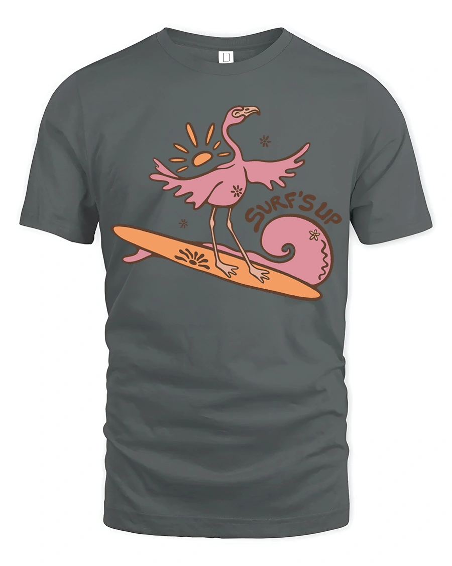 The Surfing Flamingo Surfs Up Beach Vibes Funny Graphic Tee brings playful energy and tropical charm to your everyday style.