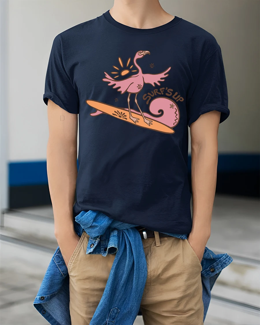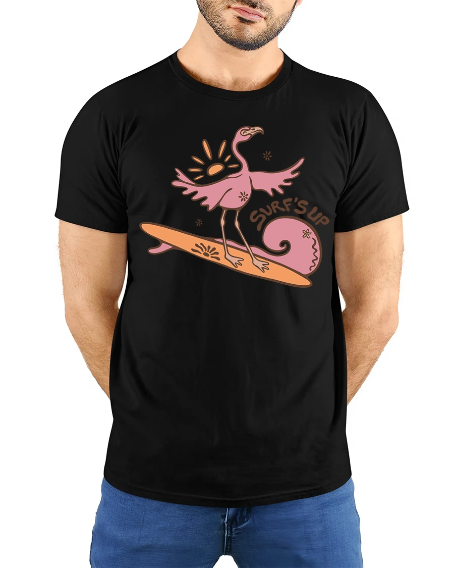 The Surfing Flamingo Surfs Up Beach Vibes Funny Graphic Tee offers a comfortable feel and eye catching style that works well with casual outfits.
