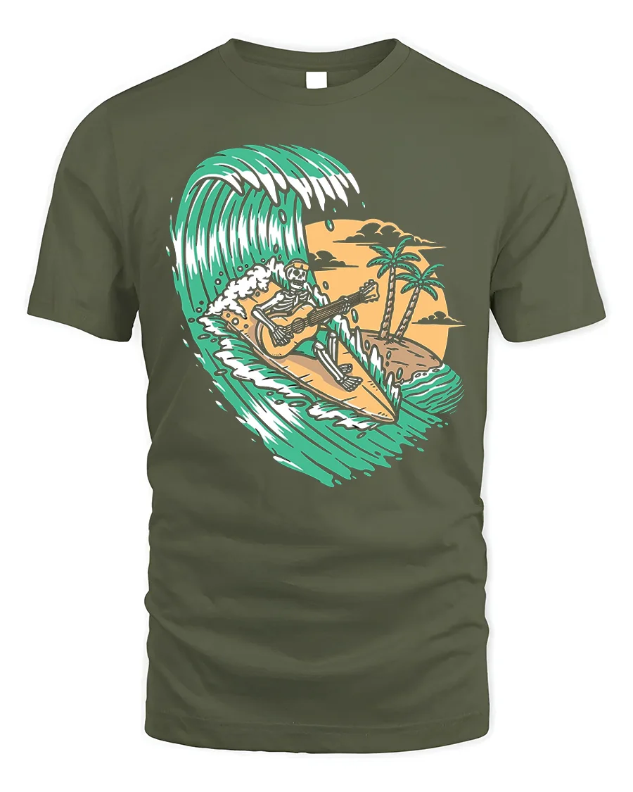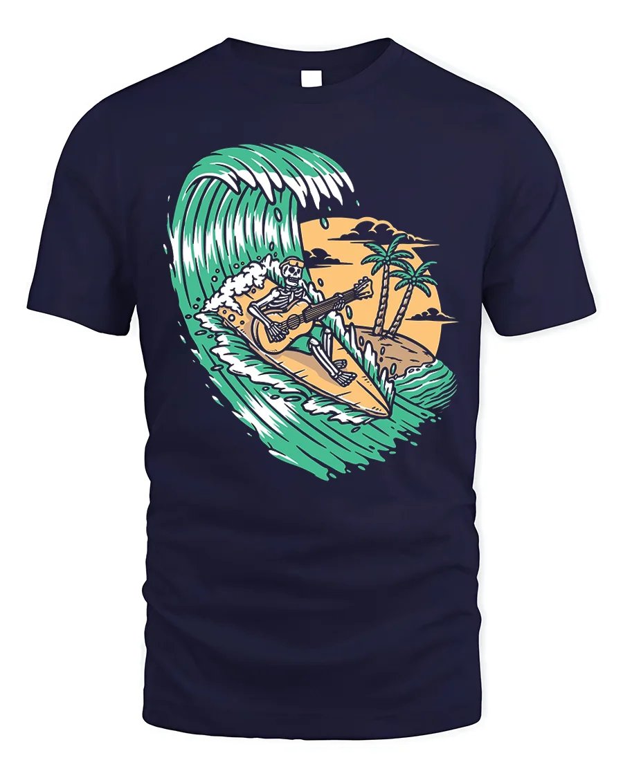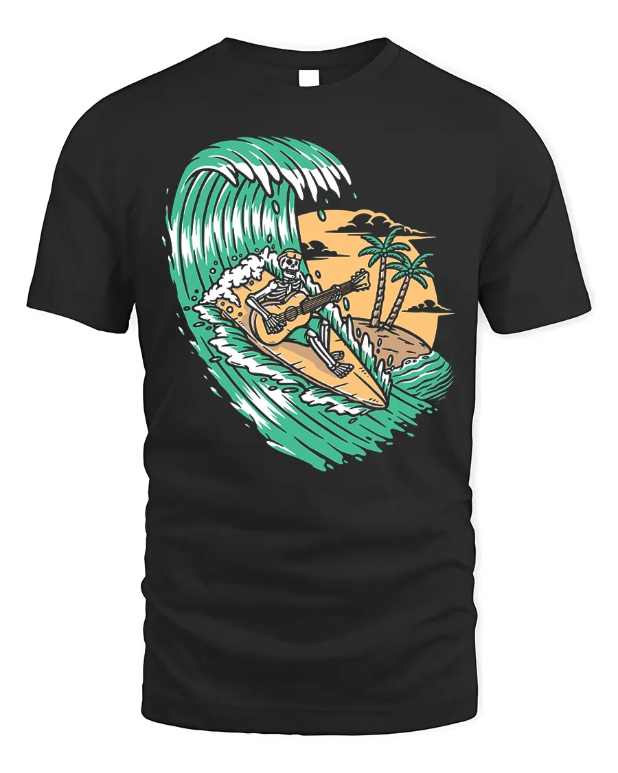 Ride the waves in style with the Surfing Skeleton Guitar Tropical Wave Graphic T-Shirt. Featuring a bold design of a skeleton riding a massive wave while playing guitar, this shirt perfectly combines beach vibes, music, and a touch of dark humor. The tropical background with palm trees and sunset adds a vibrant detail, making it a standout piece for surf lovers and fans of unique graphic tees.