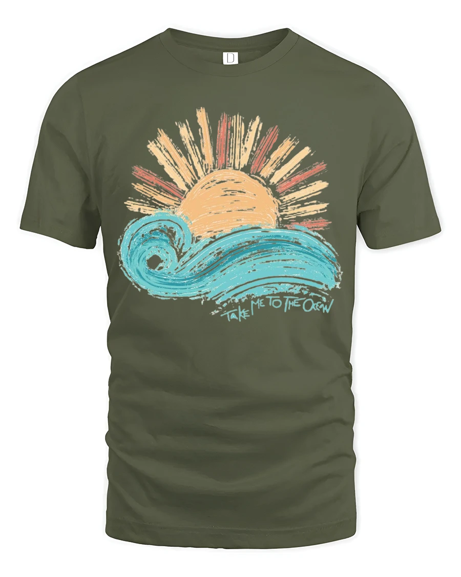 Take Me To The Ocean Wave Sunset Graphic T Shirt Tee - military green t-shirt on white background