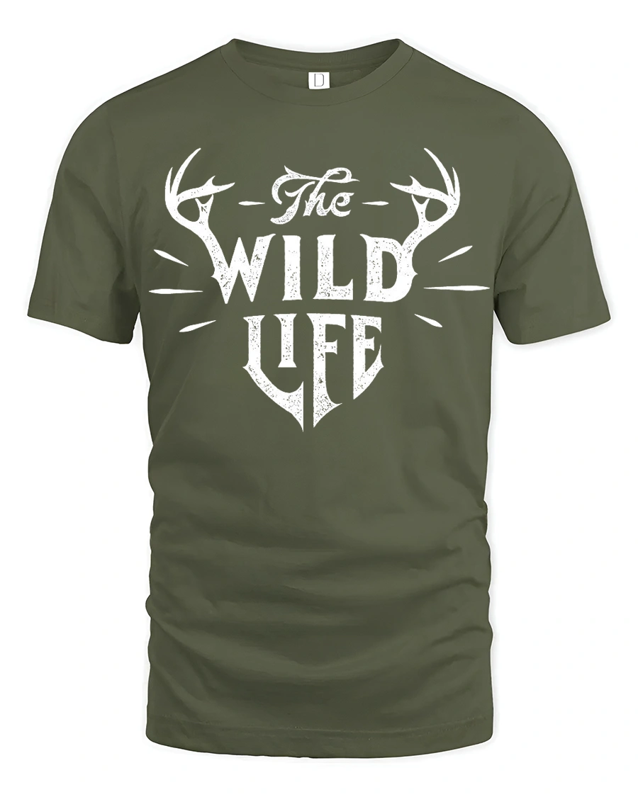 The Wild Life Deer Antlers Graphic T Shirt Rustic Nature Style Tee - military green t-shirt on white background